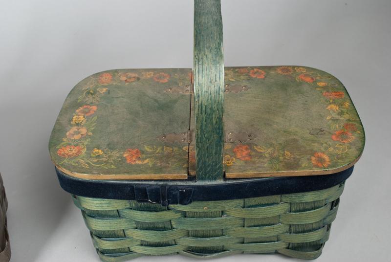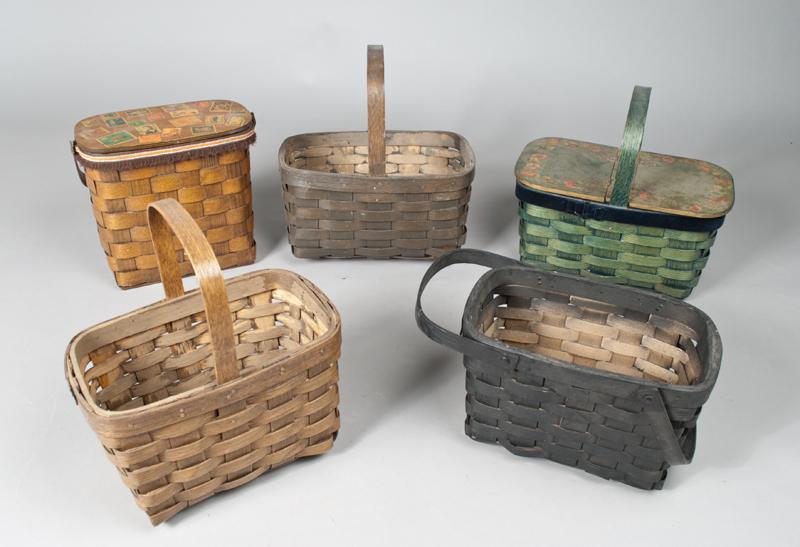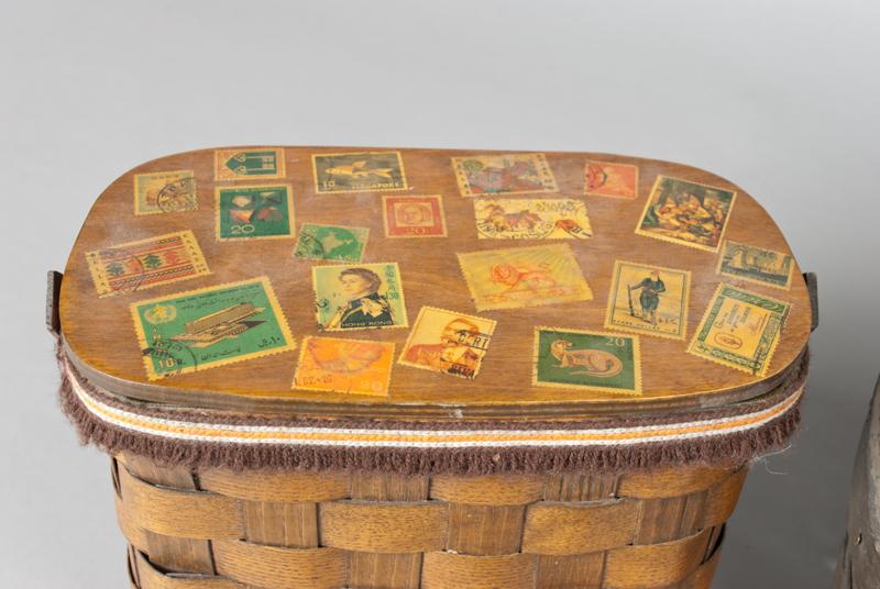 Includes stained basket, black painted basket, brown painted basket, green basket with lined interior and two part lid, and basket with lined interior and hinged lid depicting old stamps. Tallest 12.25" H.
