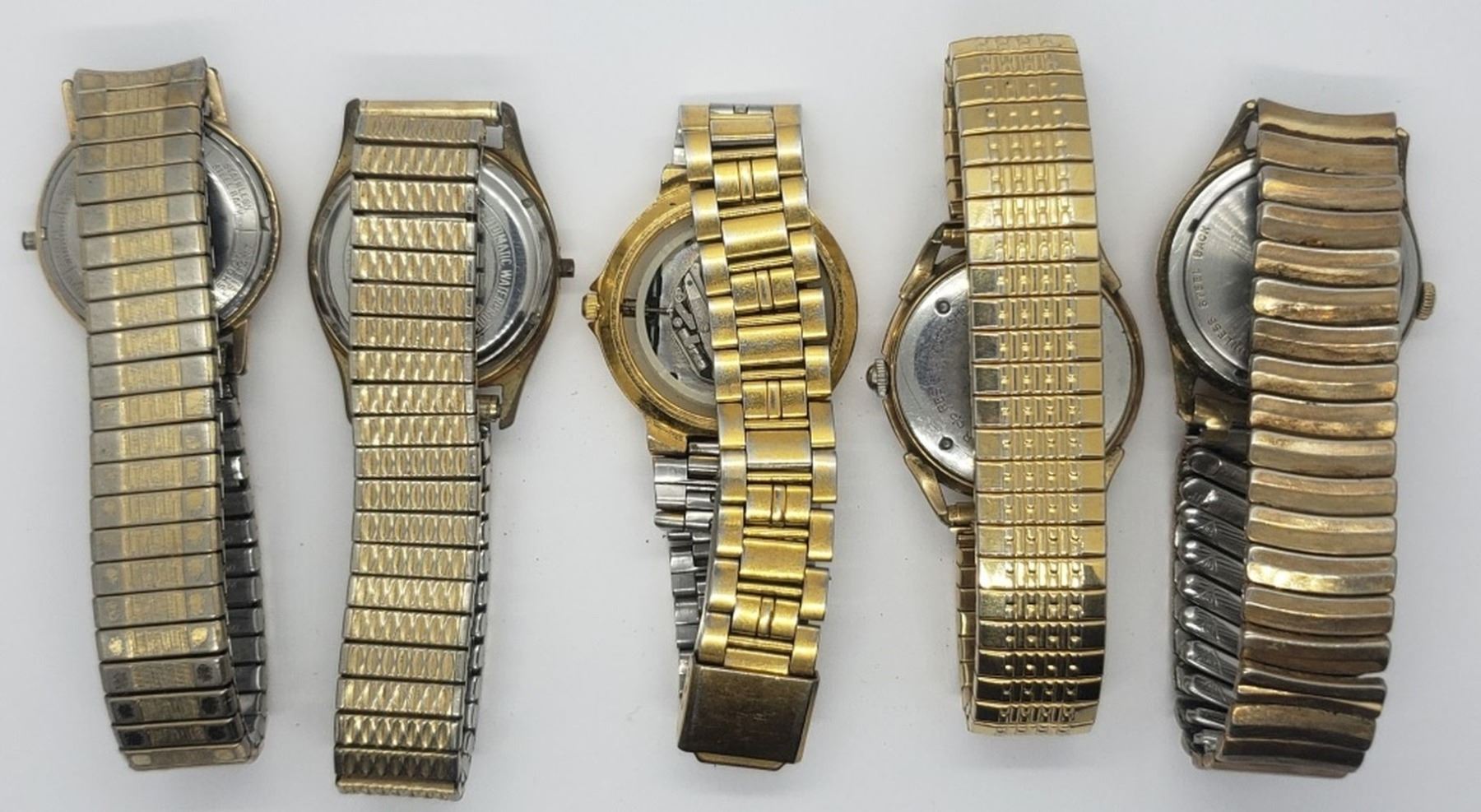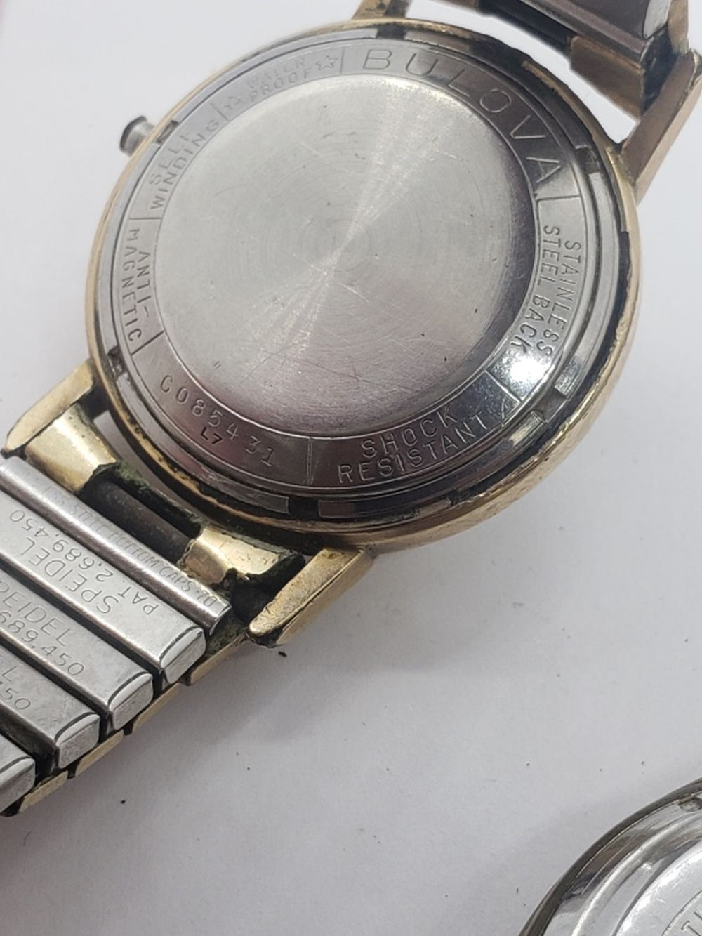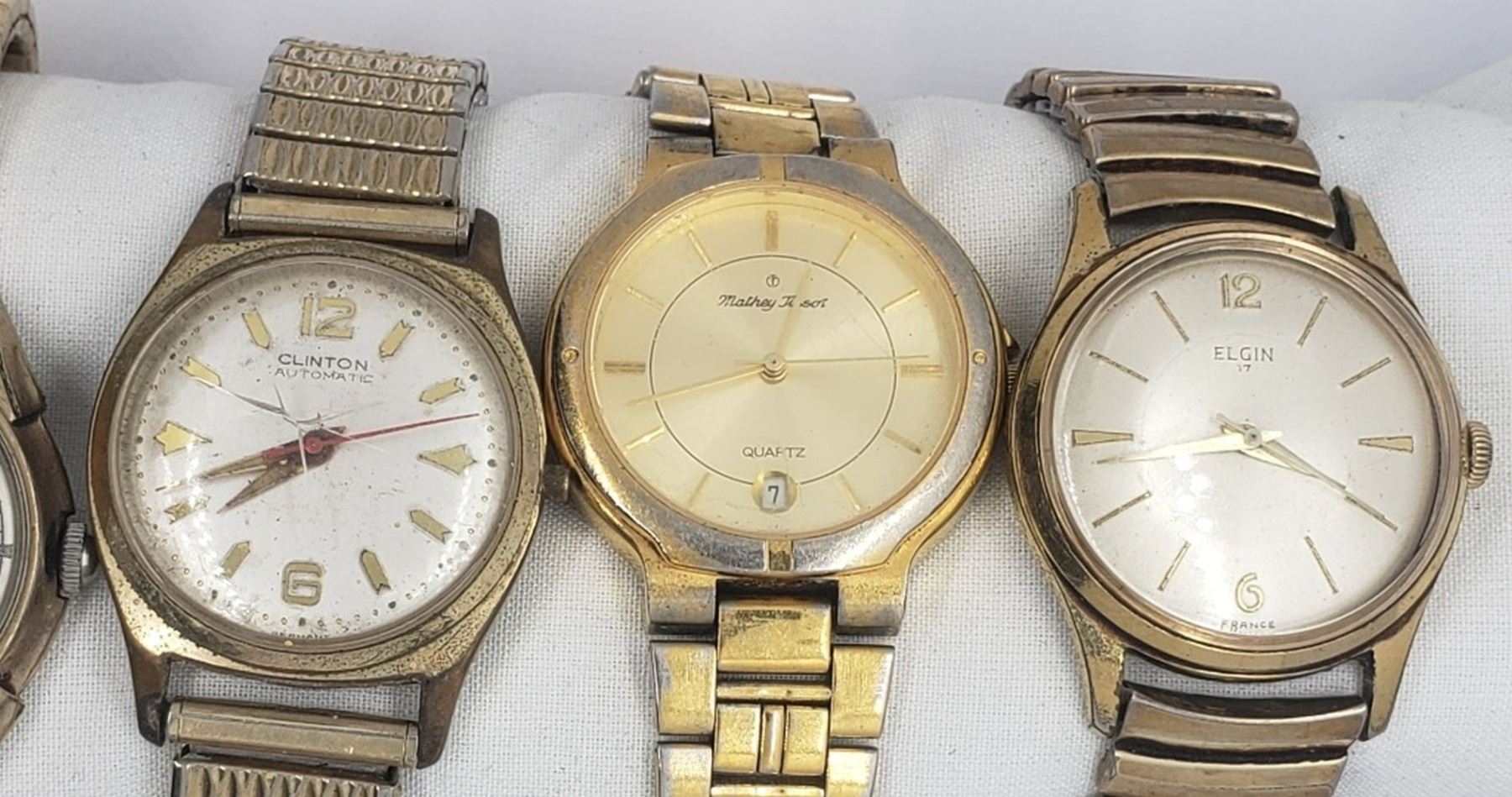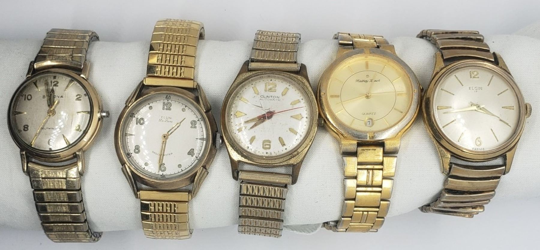 ELGIN, CLINTON (RUNS - CRYSTAL CRACKED), MATHEY TISSON (MISSING BACK), ELGIN DELUX, BULOVA (MISSING WINDING BUTTON) - (NOT RUNNING UNLESS MENTIONED- NO MISSING PARTS UNLESS MENTIONED)