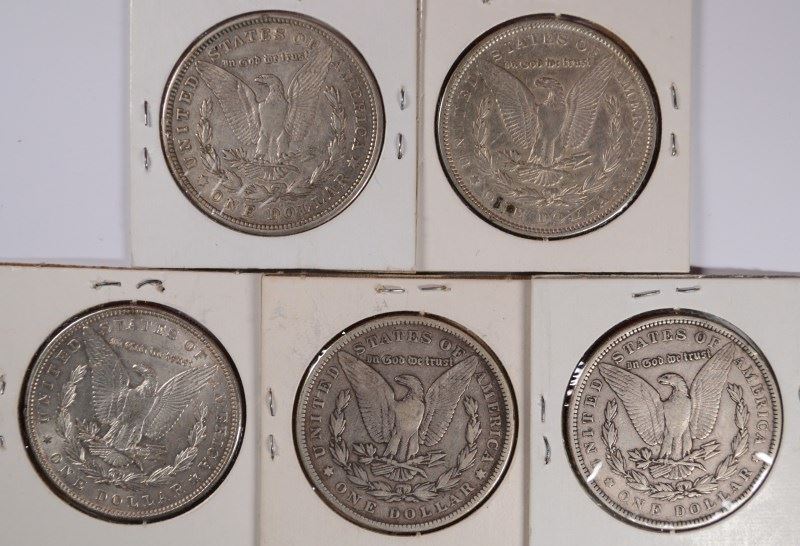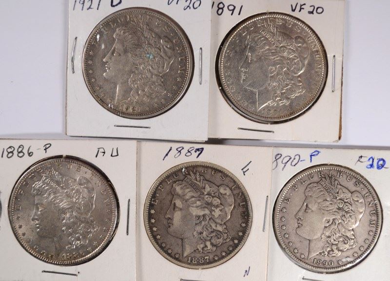( 5 ) MORGAN SILVER DOLLARS FINE OR BETTER: 1886, 1887, 1890, 1891 AND 1921-D