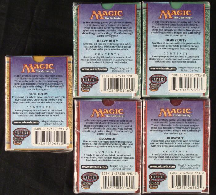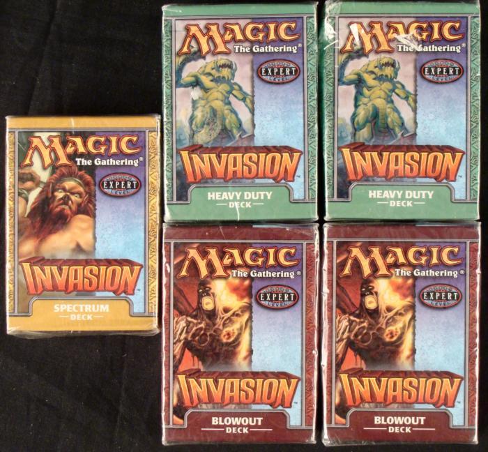Here we have 5 Magic the Gathering Decks from the Invasion series. In this lot you will receieve:Invasion- Sepctrum(2) Invasion- Blowout(2) Invasion- Heavy DutyAll of the decks have never be opened and are in their original package.Invasion sports a lot of new features never seen before. Some new cards now have a kicker, an optional casting cost that can boost the effect of a card later in the game, at the cost of a slightly less effective cost early in the game. In addition, the new set also introduces the split card, a card with two mini cards printed on each card. Each half is less effective then a comparable spell would be, but the added flexibility of having two choices of which card to take can more than make up for the deficiency.