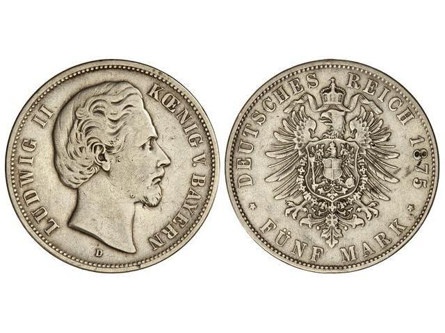 5 Marcos. 1875-D. LUIS II. BAVIERA. AR. (Pequeños golpecitos). KM-502. MBC.