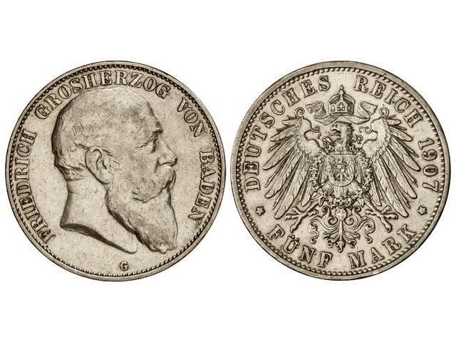 5 Marcos. 1907-G. FEDERICO I. BADEN. AR. (Rayitas en anverso). KM-274. MBC+.