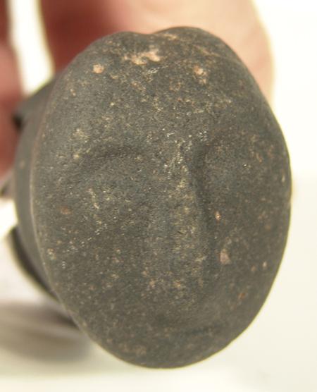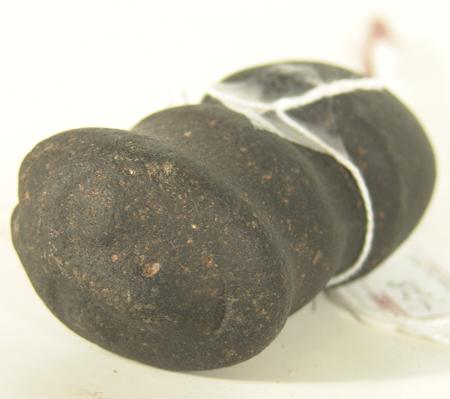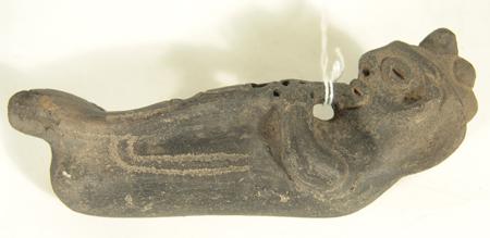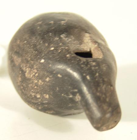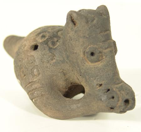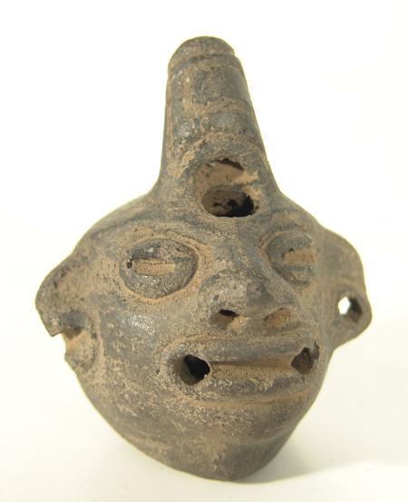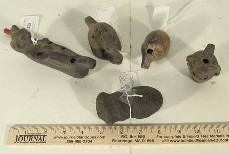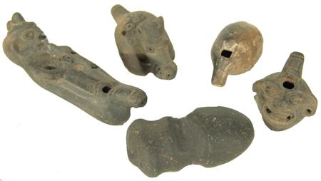 Collection of 4 ancient hand formed clay whistles, all in very good condition, plus an even older double grooved stone axehead with human faces in excellent condition. 2-1/2" to 5-1/2"