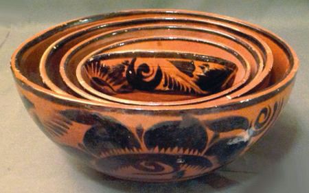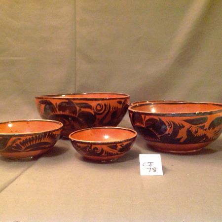 Mid 1900s, Collection of five Old Mexico style glazed nesting pottery bowls from Michoacan. Good condition. Largest 4-3/4" x 5-1/8"