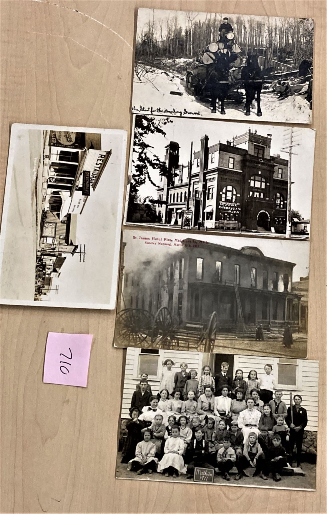 5 Michigan Real Photo Postcards Logging, Fire, Opera, Store Front & Class