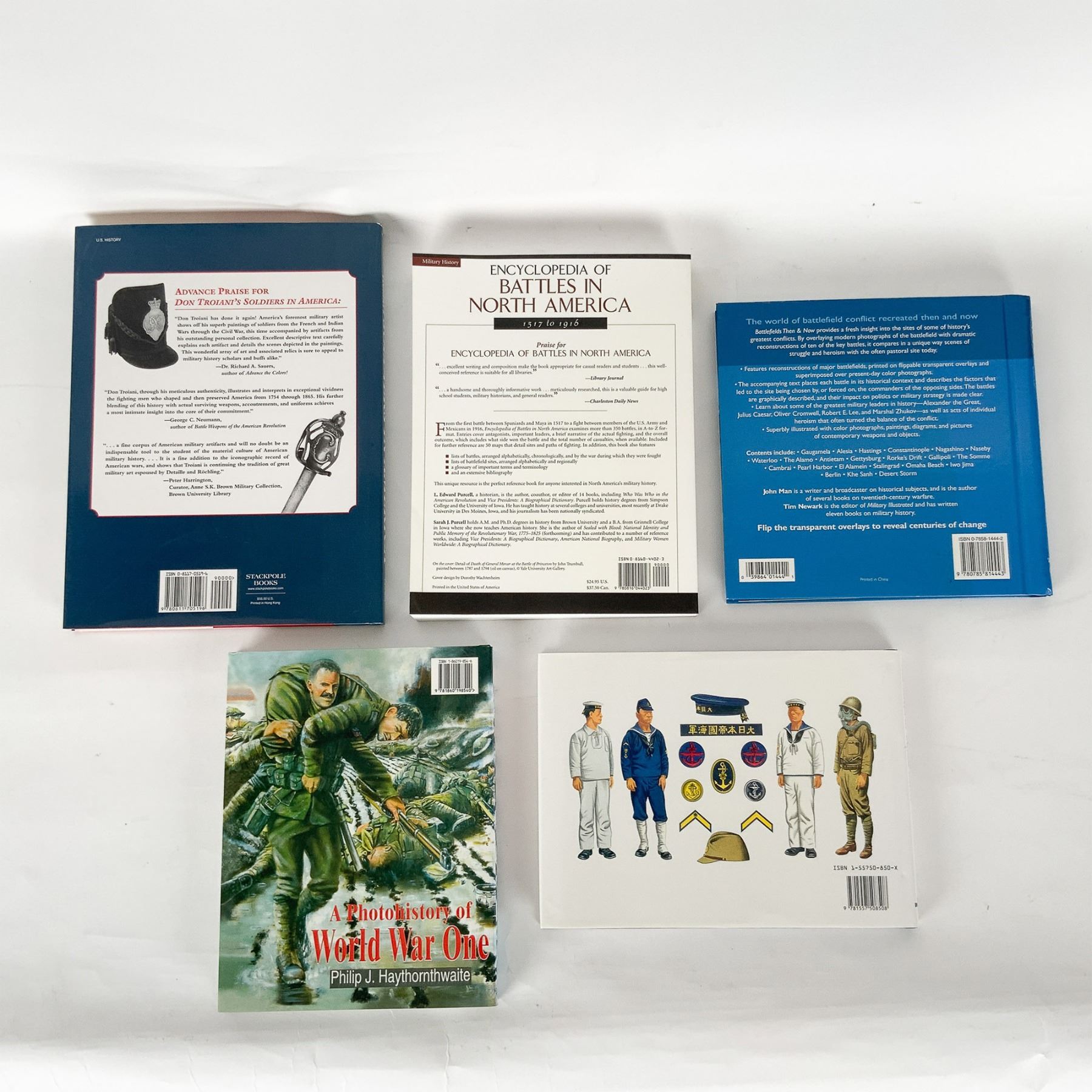 This lot includes five military history books, each offering in-depth insights into uniforms, battles, and soldiers from various historical conflicts. Uniforms & Insignia of the Navies of World War II provides detailed illustrations of naval uniforms compiled by U.S. Naval Intelligence. Encyclopedia of Battles in North America: 1517 to 1916 by L. Edward Purcell and Sarah J. Purcell covers major engagements from early colonial wars to World War I. A Photohistory of World War One by Philip J. Haythornthwaite presents a powerful visual documentation of the Great War. Don Troiani's Soldiers in America: 1754-1865 showcases historical artwork of military figures with text by Earl J. Coates and James L. Kochan. Battlefields Then & Now by John Man & Tim Newark explores key battles through vivid reconstructions. A great collection for history enthusiasts, researchers, and collectors of military literature.