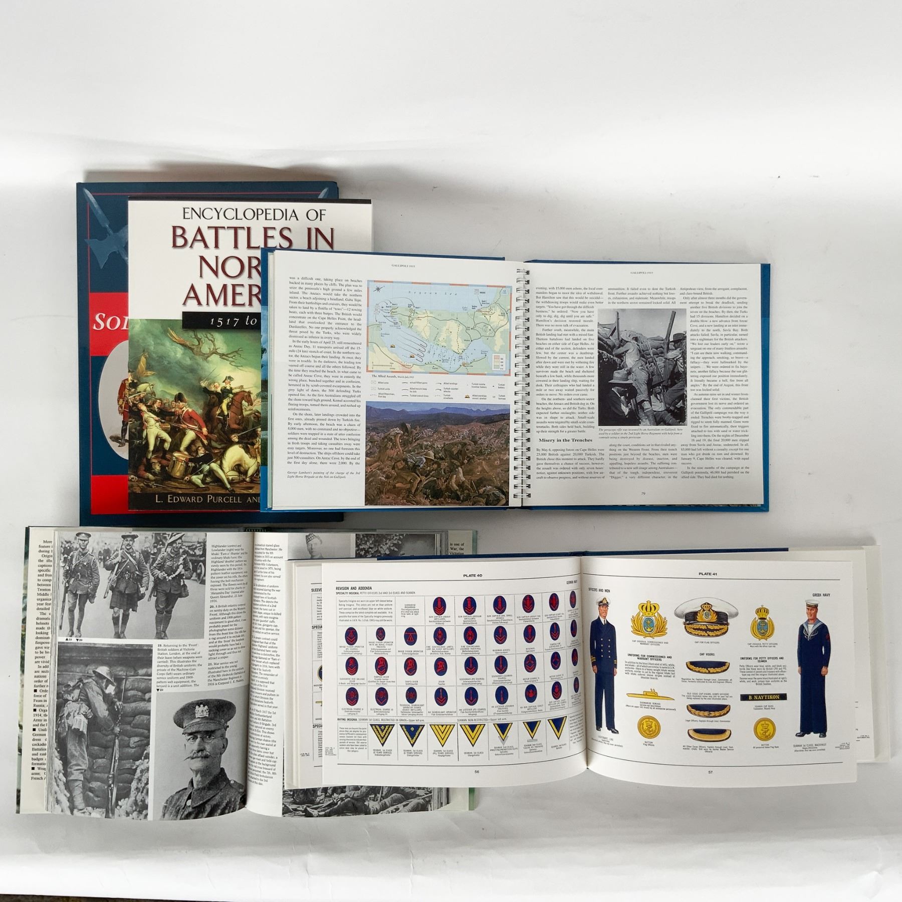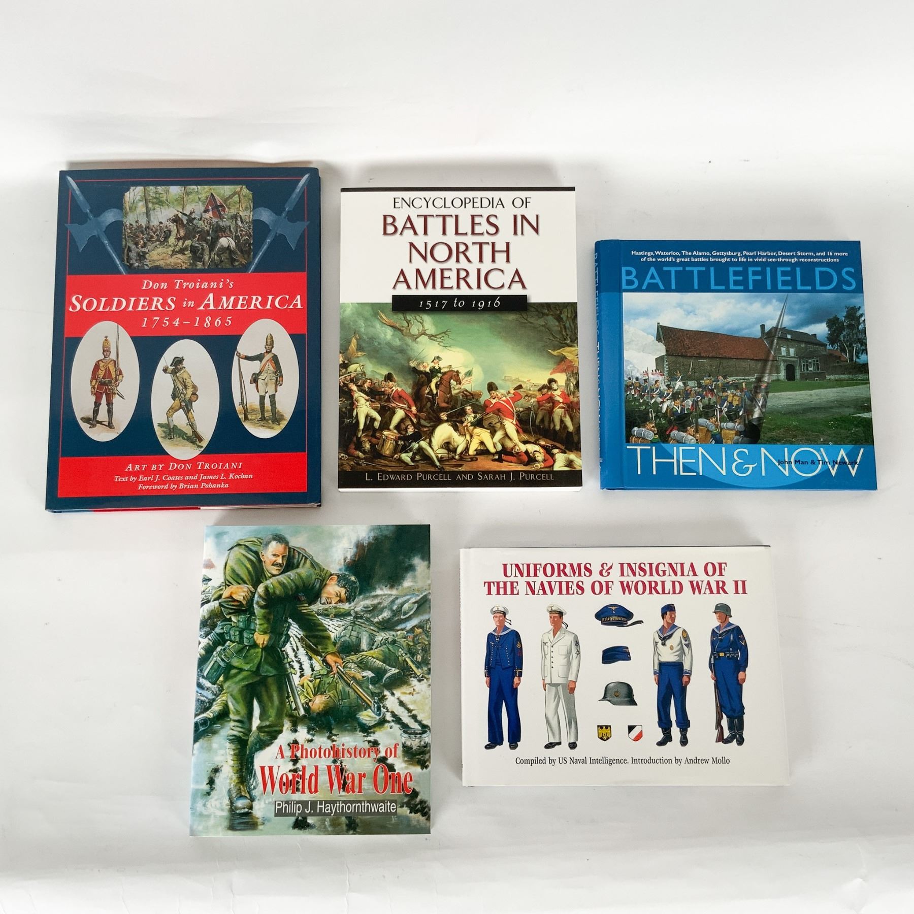 This lot includes five military history books, each offering in-depth insights into uniforms, battles, and soldiers from various historical conflicts. Uniforms & Insignia of the Navies of World War II provides detailed illustrations of naval uniforms compiled by U.S. Naval Intelligence. Encyclopedia of Battles in North America: 1517 to 1916 by L. Edward Purcell and Sarah J. Purcell covers major engagements from early colonial wars to World War I. A Photohistory of World War One by Philip J. Haythornthwaite presents a powerful visual documentation of the Great War. Don Troiani's Soldiers in America: 1754-1865 showcases historical artwork of military figures with text by Earl J. Coates and James L. Kochan. Battlefields Then & Now by John Man & Tim Newark explores key battles through vivid reconstructions. A great collection for history enthusiasts, researchers, and collectors of military literature.