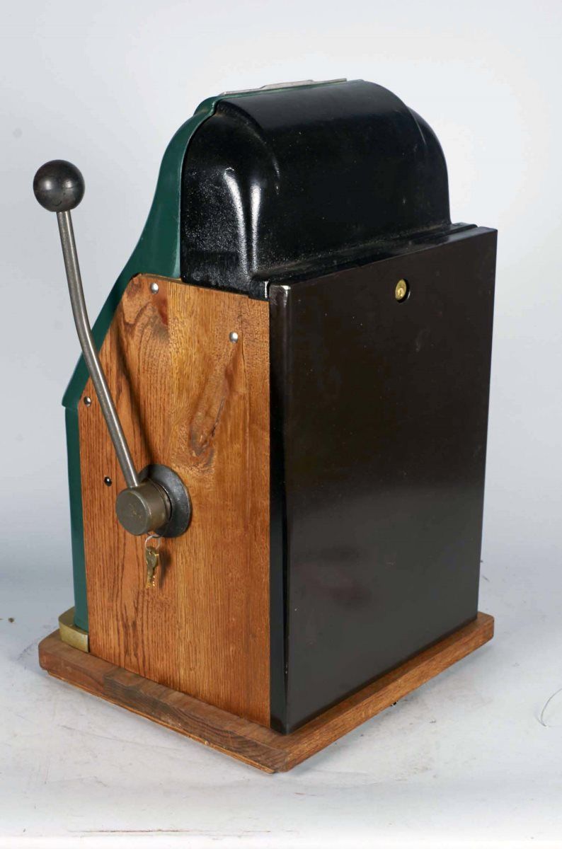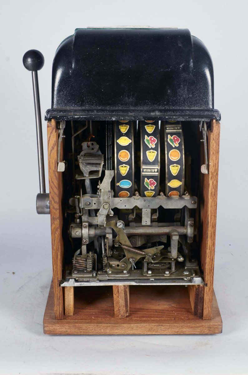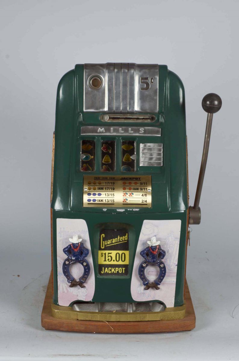 5 ¢ Mills High Top Escalator Bell 3-Reel Slot Machine w/ 2 front cowboy castings, Reproduction case, On free play Condition Very Good Size 16" x 15" x 25-1/2"Includes key.