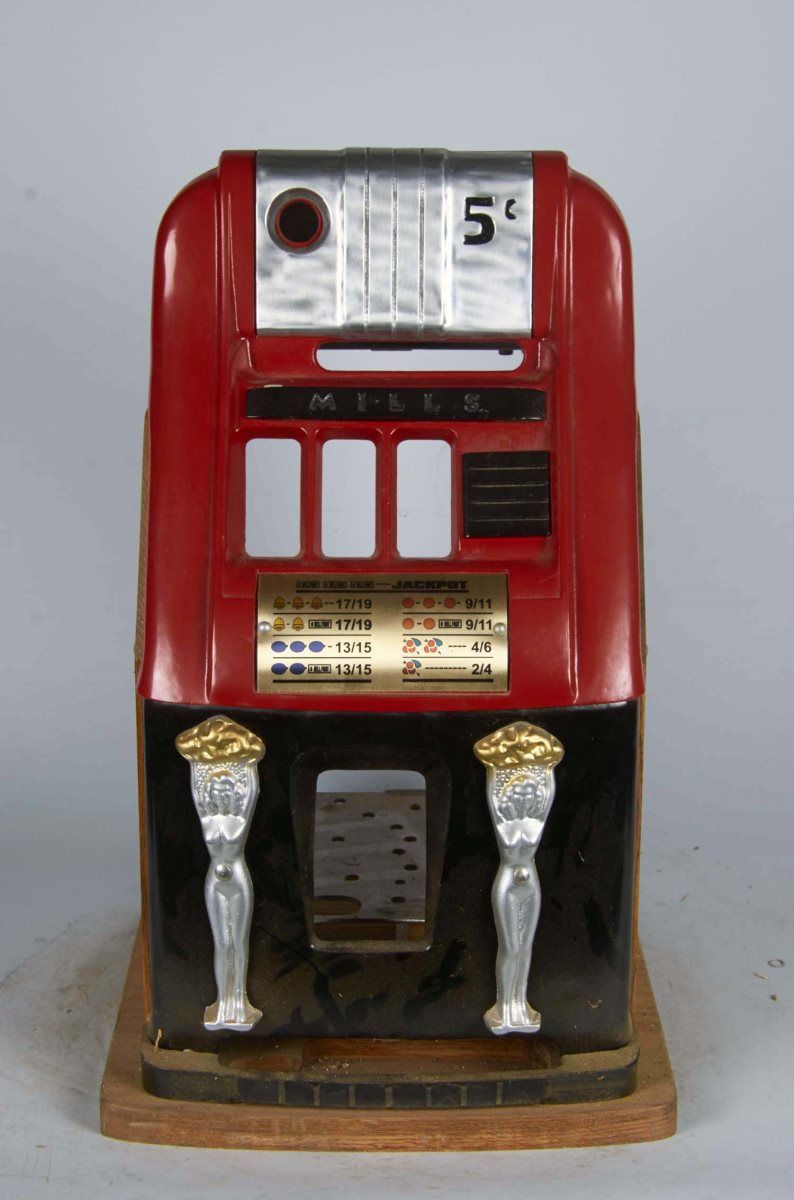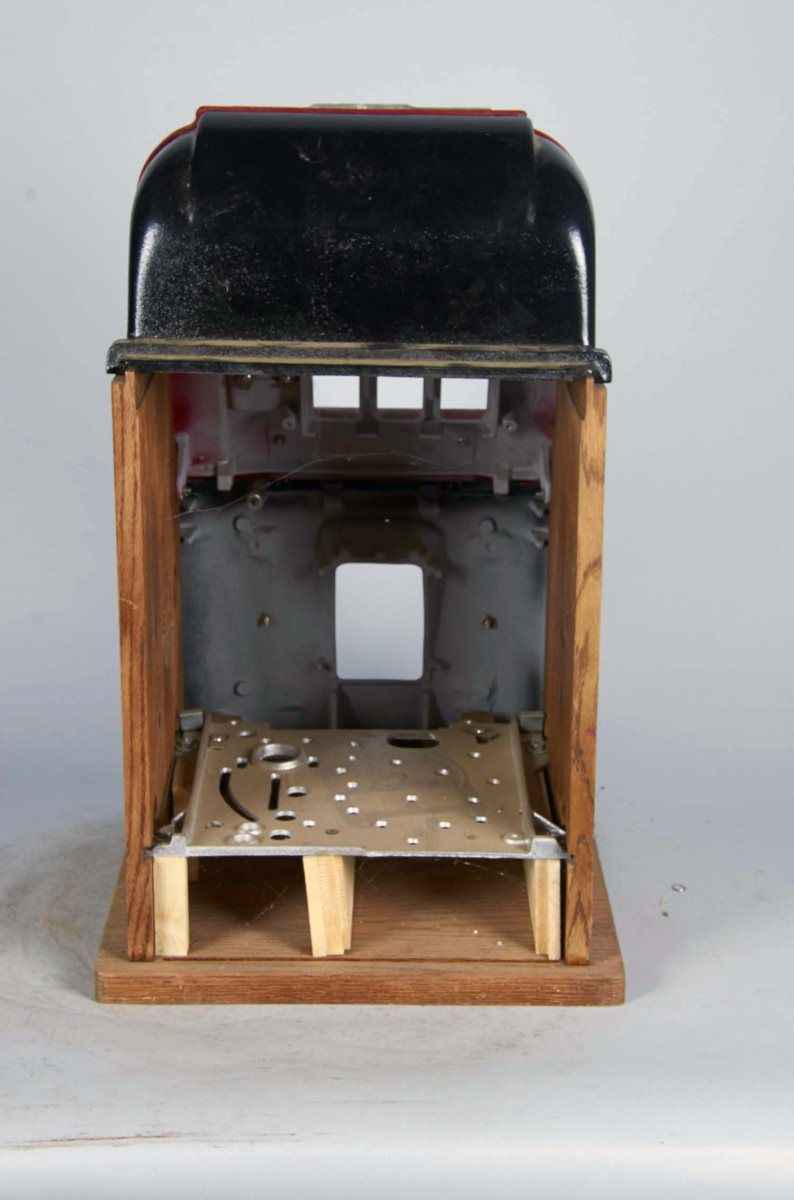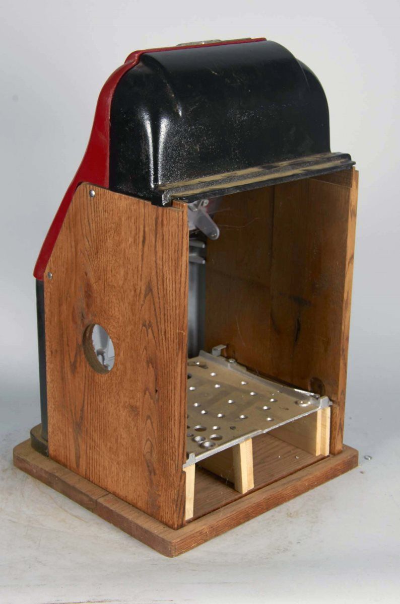Reproduction slot machine case (Case only, No mechanism) w/ "Golden Doll" Golden Nugget girls style front castings Condition Fair - Good Size 16" x 15" x 25-1/2"