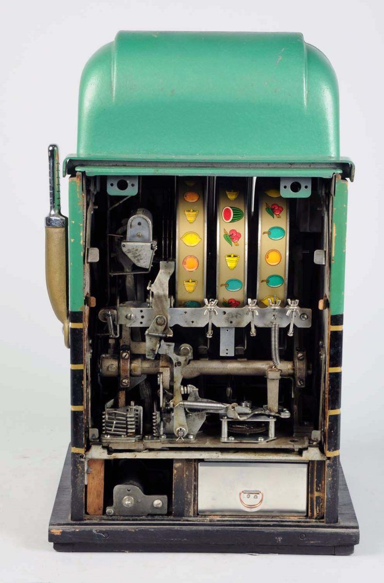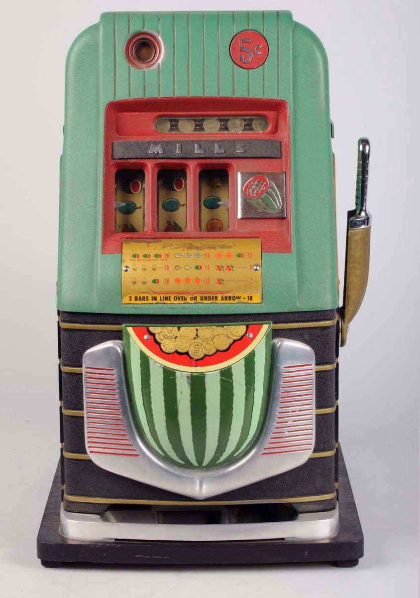 5 ¢ Mills Melon Bell High Top Escalator Bell Slot Machine c1948, Original condition, Has two 1/8" drill holes at coin entry, Works - plays & pays w/ key Condition (Excellent). Size 26" T.
