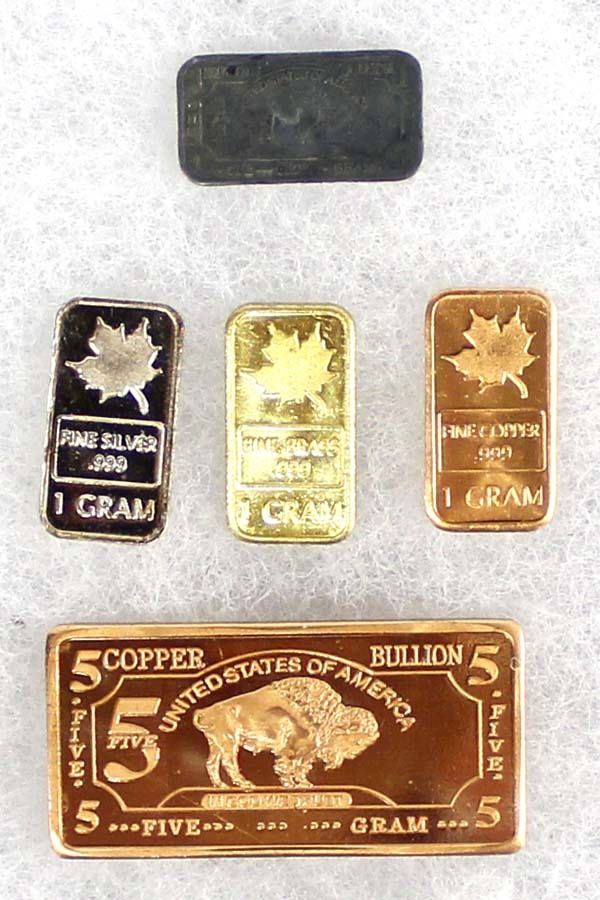 5 Miniature Ingots, largest measures 1.25'' x .5'', includes 5 Bullion Copper, 3 Maple Leaf Bars (.999 Pure Silver, Copper, and Brass), and 1 Troy Gram .999 Pure, Bullion, Molybdenum