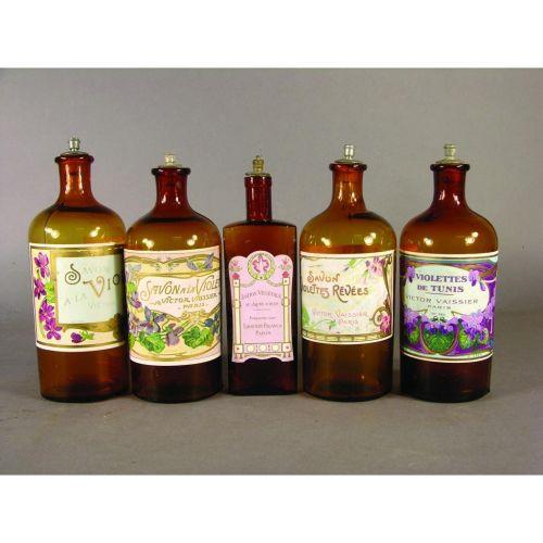 5 Misc. Toiletry Bottles including Savon Violetttes Revees. Amber bottles with original caps and paper labels. All in excellent condition, 7 1/2 inches tall.