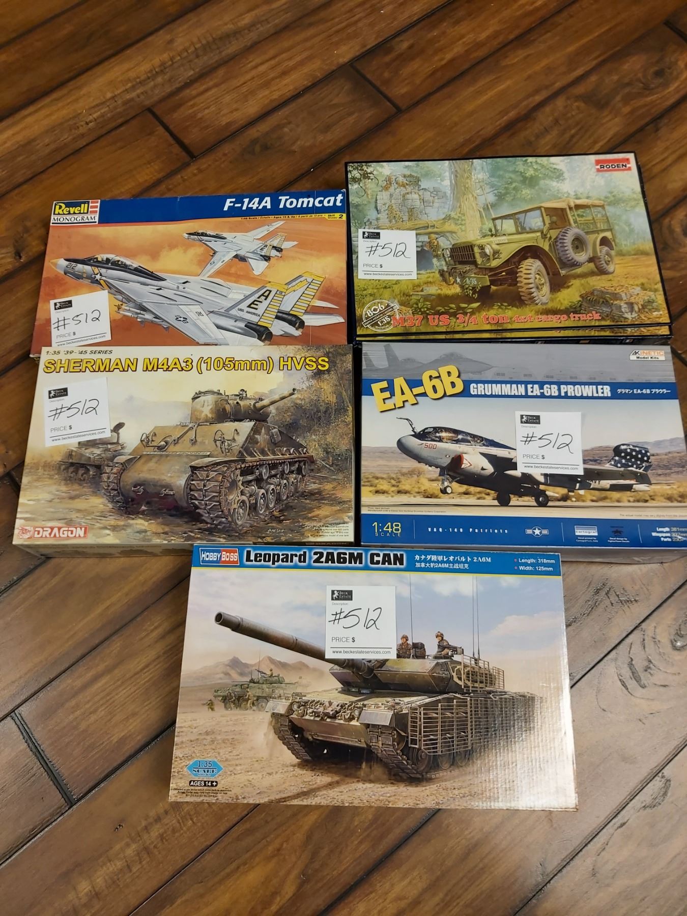 5 Models. EA-6B Grumman Prowler. - Sherman M4A3 HVSS. - F-14A Tomcat. - M37 US 3/4 Ton 4x4 Cargo Truck. - Leopard 2A6M Can