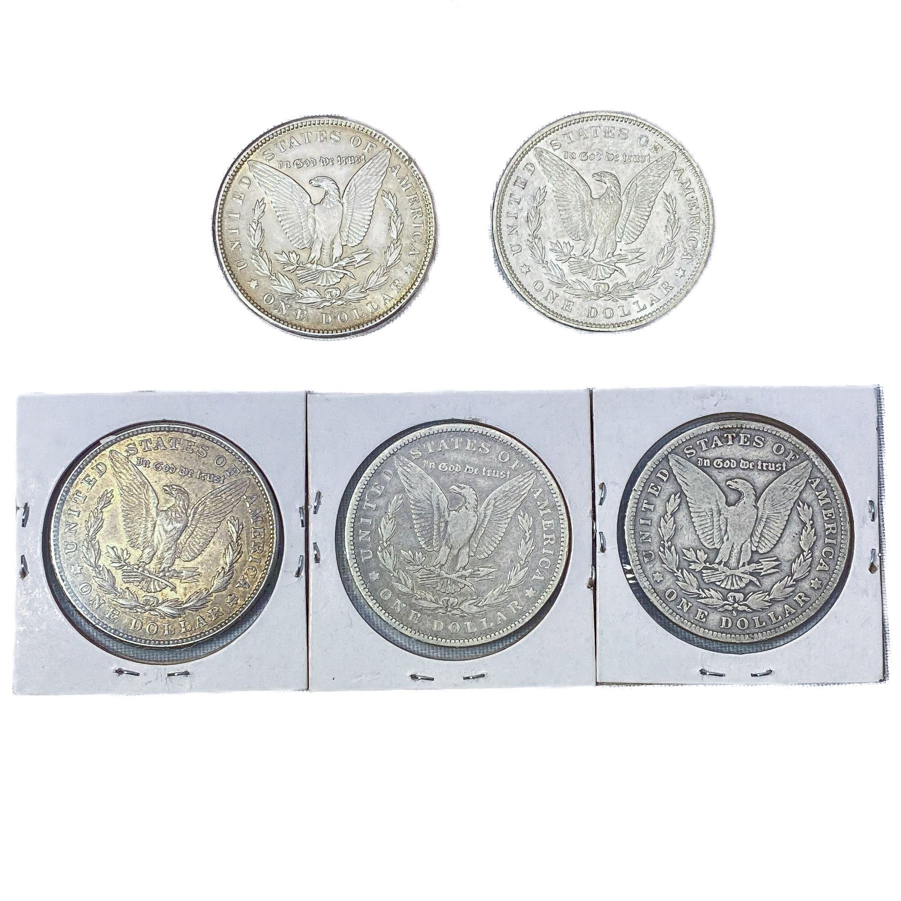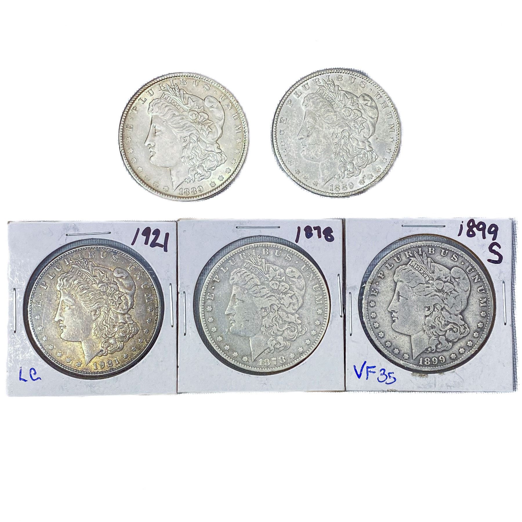 (5) Morgan Silver Dollars (1878, (2) 1889, 1899-