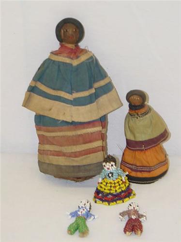 (5) NATIVE AMERICAN DOLLS: (2) SEMINOLE COCONUT HUSK DOLLS W/ CLOTH DRESSES & (3) BEADED DEER TOE DOLLS - WEAR & IMPERFECTIONS