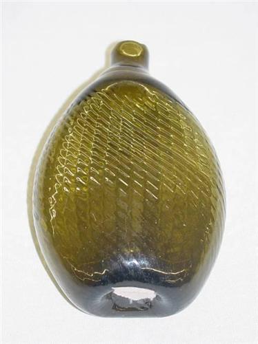 5" NEW ENGLAND 36 RIBBED PITKIN 1/2 PINT FLASK - LIGHT OLIVE GREEN W/ OPEN PONTIL - VERY SMALL STRESS CRACK NEAR SHOULDER (APPROX. 1/4");
