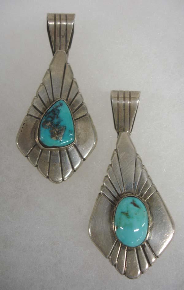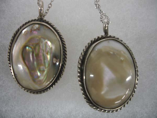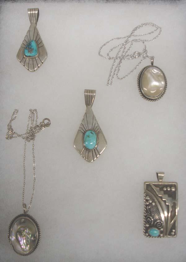 5 Native American Navajo Silver Turquoise, MOP, & Abalone Pendants, 2 With Silver Chains, longest pendant measures 2'' x 1''. Buyers Pay Actual Shipping and Handling Charges(see terms and conditions for more information).