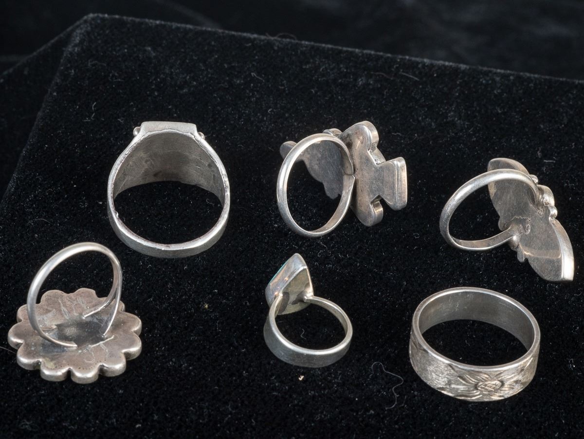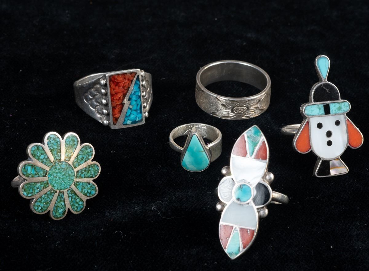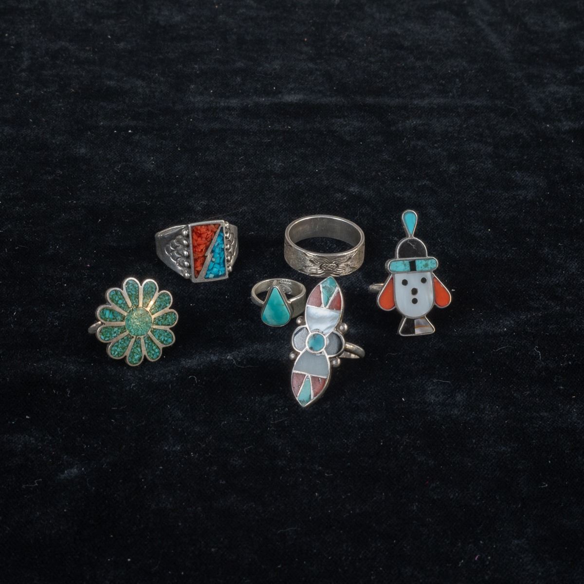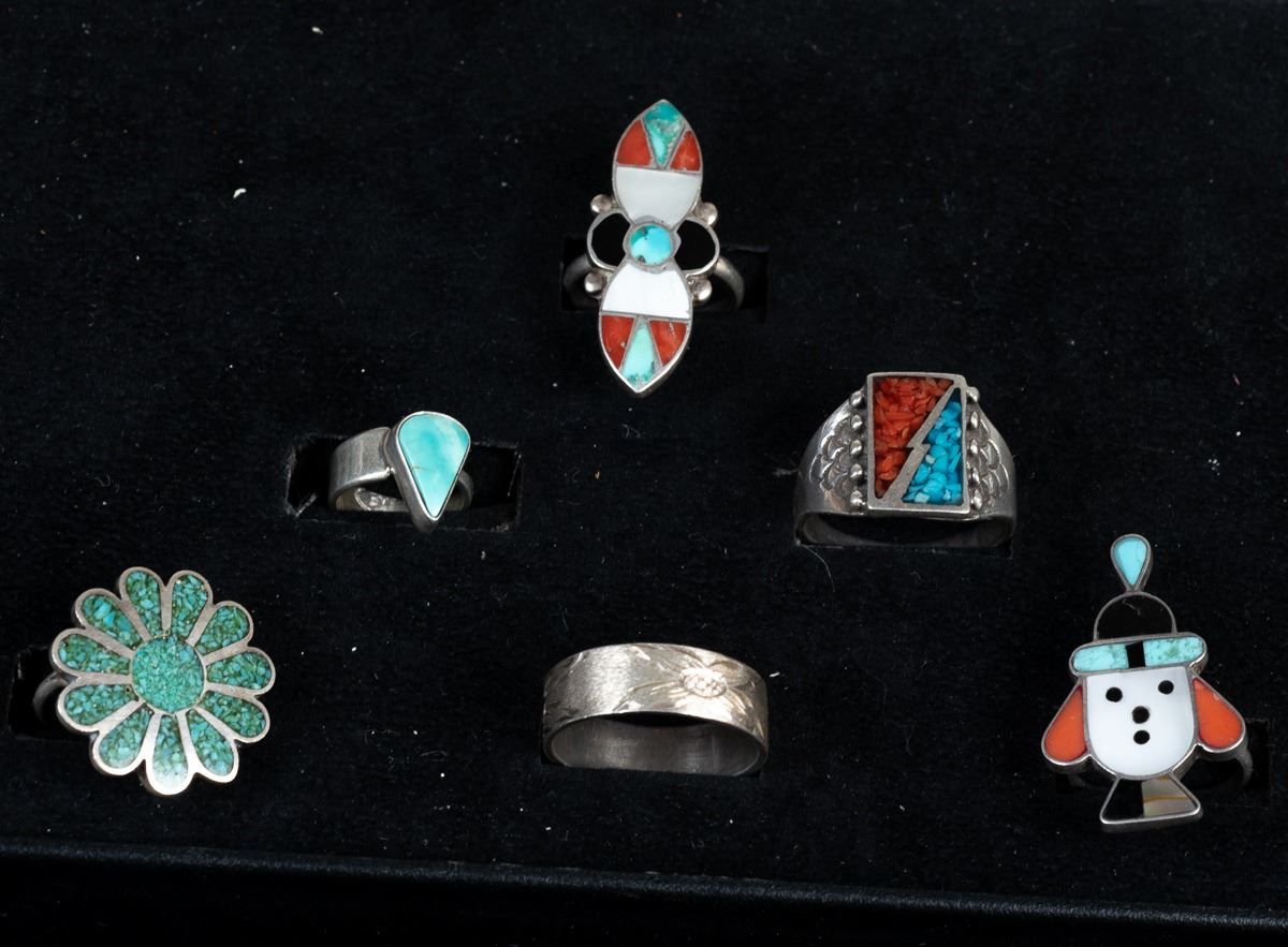 5 Native American Rings and 1 Sterling Band Ring, includes 1. Zuni Sterling Inlay Ring, size 6.75 and measures 1.25''L x 5/8''W, inlay includes jet, turquoise, mother of pearl, and coral 2. Navajo Sterling Turquoise Child's Ring by Everett & Mary Teller, size 2 and measures .5''L, hallmarked and stamped sterling 3. Navajo Sterling Chip Inlay Coral and Turquoise Ring, size 11 and measures .75''L 4. 1960s Navajo Sterling Chip Inlay Flower Ring, size 6.25'' and measures 7/8''D, engraved initials JJ inside 5. Sterling Etched Flower Wedding Band, size 10 and measures .25''W, stamped sterling and hallmarked (unreadable) 6. Zuni Sterling Inlay Ring, size 6.25 and measures .75''W x 1.25''L, inlay includes coral, jet, turquoise, and jasper