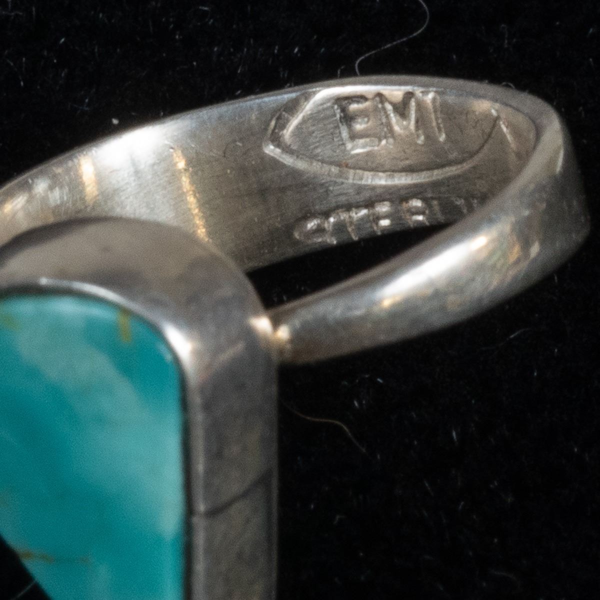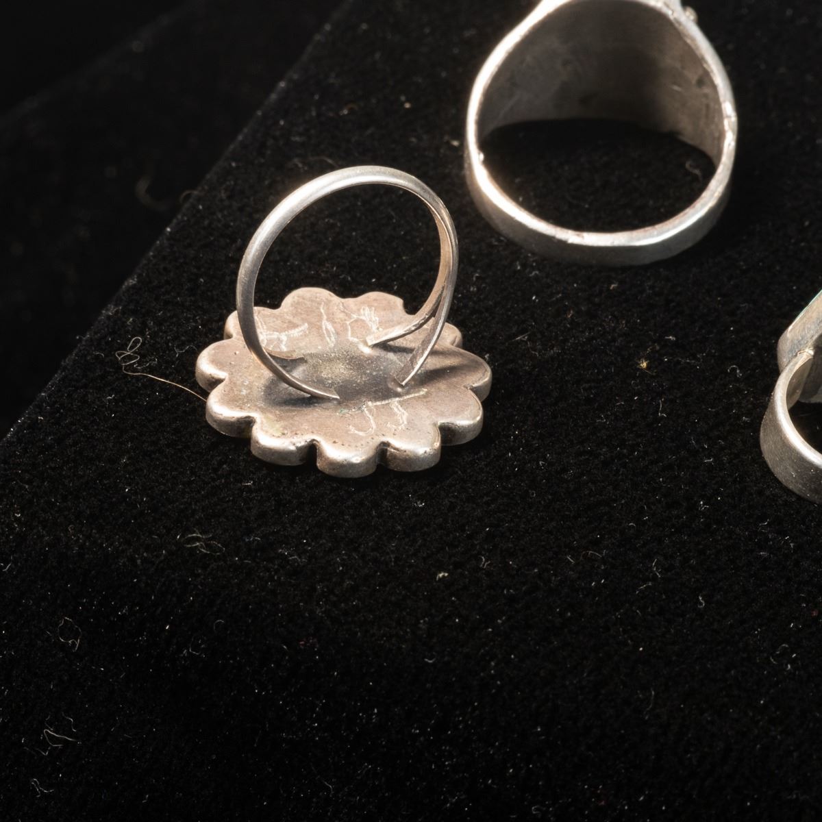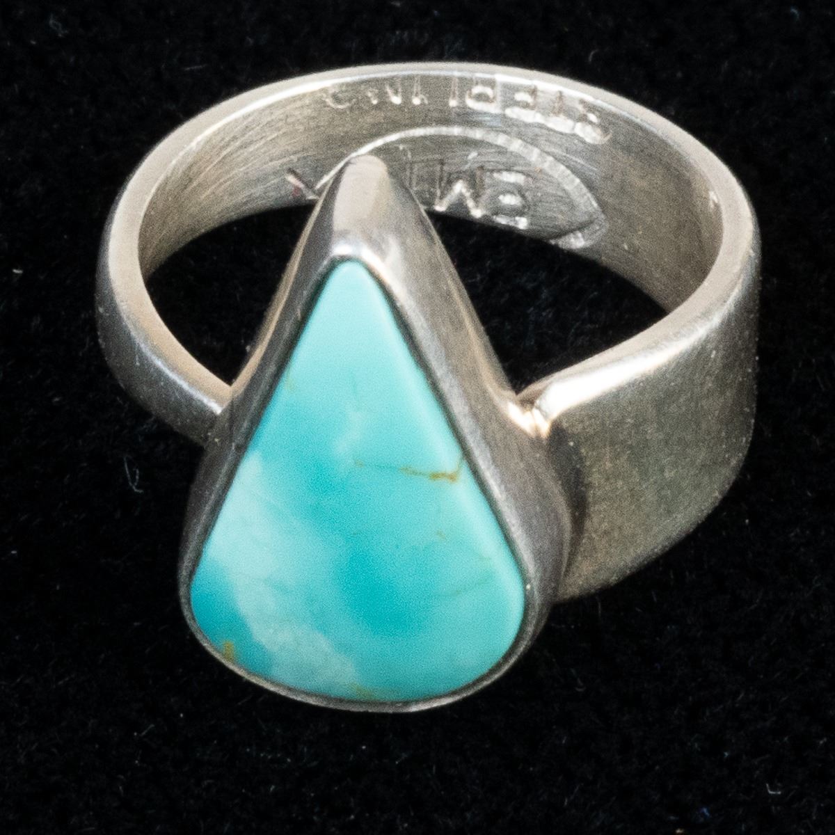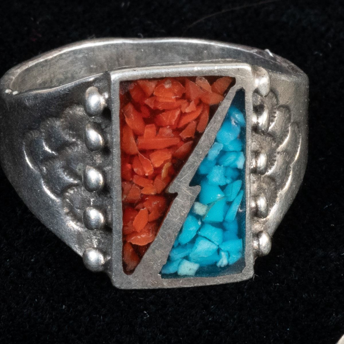 5 Native American Rings and 1 Sterling Band Ring, includes 1. Zuni Sterling Inlay Ring, size 6.75 and measures 1.25''L x 5/8''W, inlay includes jet, turquoise, mother of pearl, and coral 2. Navajo Sterling Turquoise Child's Ring by Everett & Mary Teller, size 2 and measures .5''L, hallmarked and stamped sterling 3. Navajo Sterling Chip Inlay Coral and Turquoise Ring, size 11 and measures .75''L 4. 1960s Navajo Sterling Chip Inlay Flower Ring, size 6.25'' and measures 7/8''D, engraved initials JJ inside 5. Sterling Etched Flower Wedding Band, size 10 and measures .25''W, stamped sterling and hallmarked (unreadable) 6. Zuni Sterling Inlay Ring, size 6.25 and measures .75''W x 1.25''L, inlay includes coral, jet, turquoise, and jasper
