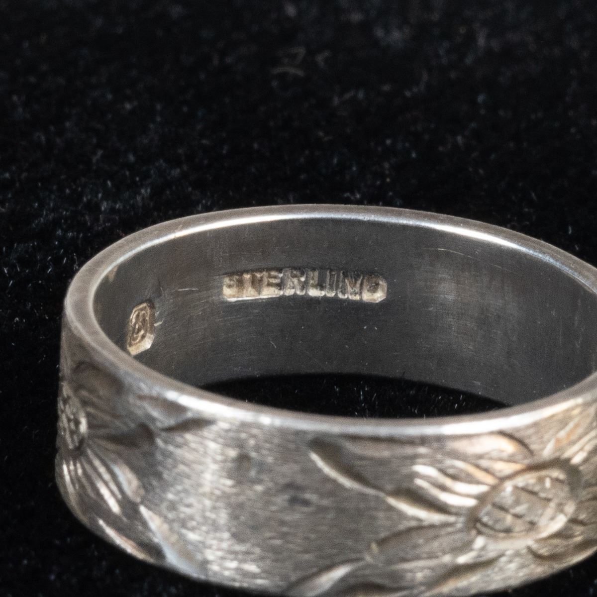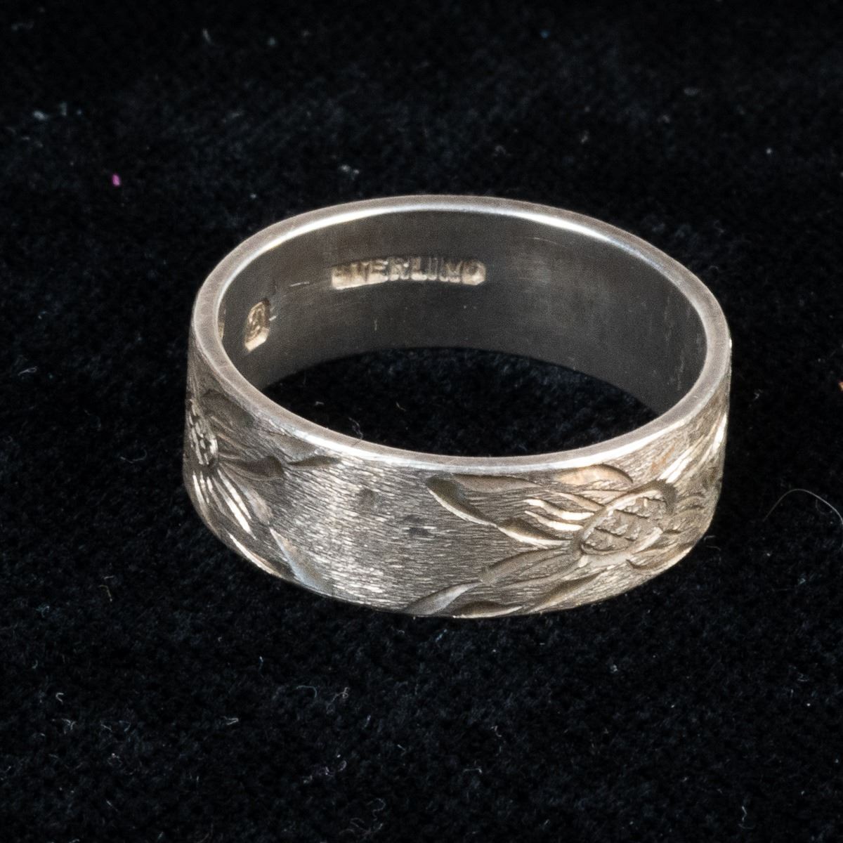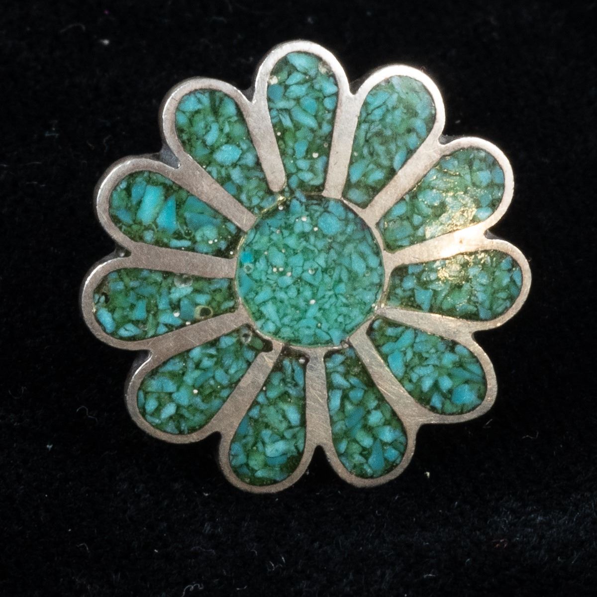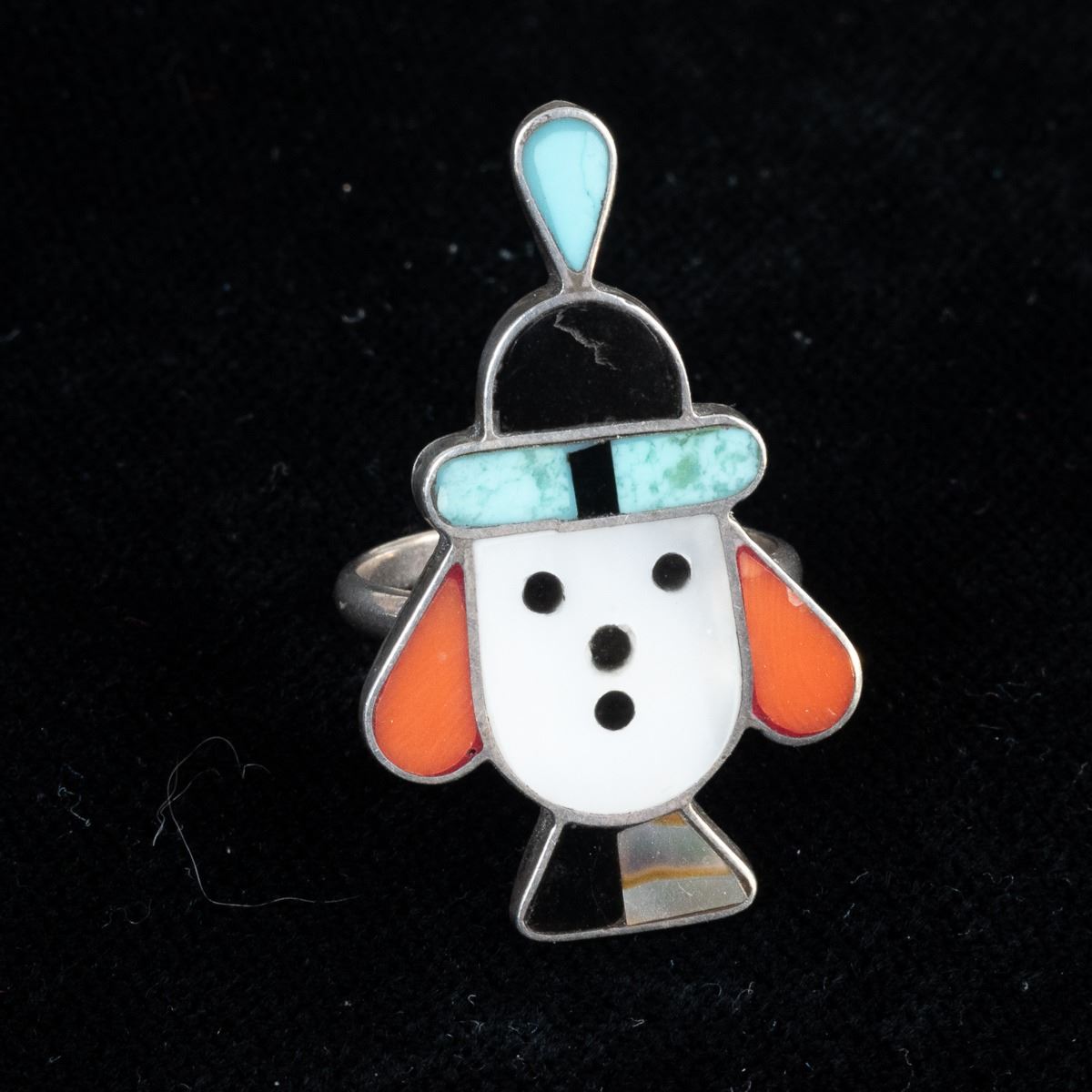 5 Native American Rings and 1 Sterling Band Ring, includes 1. Zuni Sterling Inlay Ring, size 6.75 and measures 1.25''L x 5/8''W, inlay includes jet, turquoise, mother of pearl, and coral 2. Navajo Sterling Turquoise Child's Ring by Everett & Mary Teller, size 2 and measures .5''L, hallmarked and stamped sterling 3. Navajo Sterling Chip Inlay Coral and Turquoise Ring, size 11 and measures .75''L 4. 1960s Navajo Sterling Chip Inlay Flower Ring, size 6.25'' and measures 7/8''D, engraved initials JJ inside 5. Sterling Etched Flower Wedding Band, size 10 and measures .25''W, stamped sterling and hallmarked (unreadable) 6. Zuni Sterling Inlay Ring, size 6.25 and measures .75''W x 1.25''L, inlay includes coral, jet, turquoise, and jasper