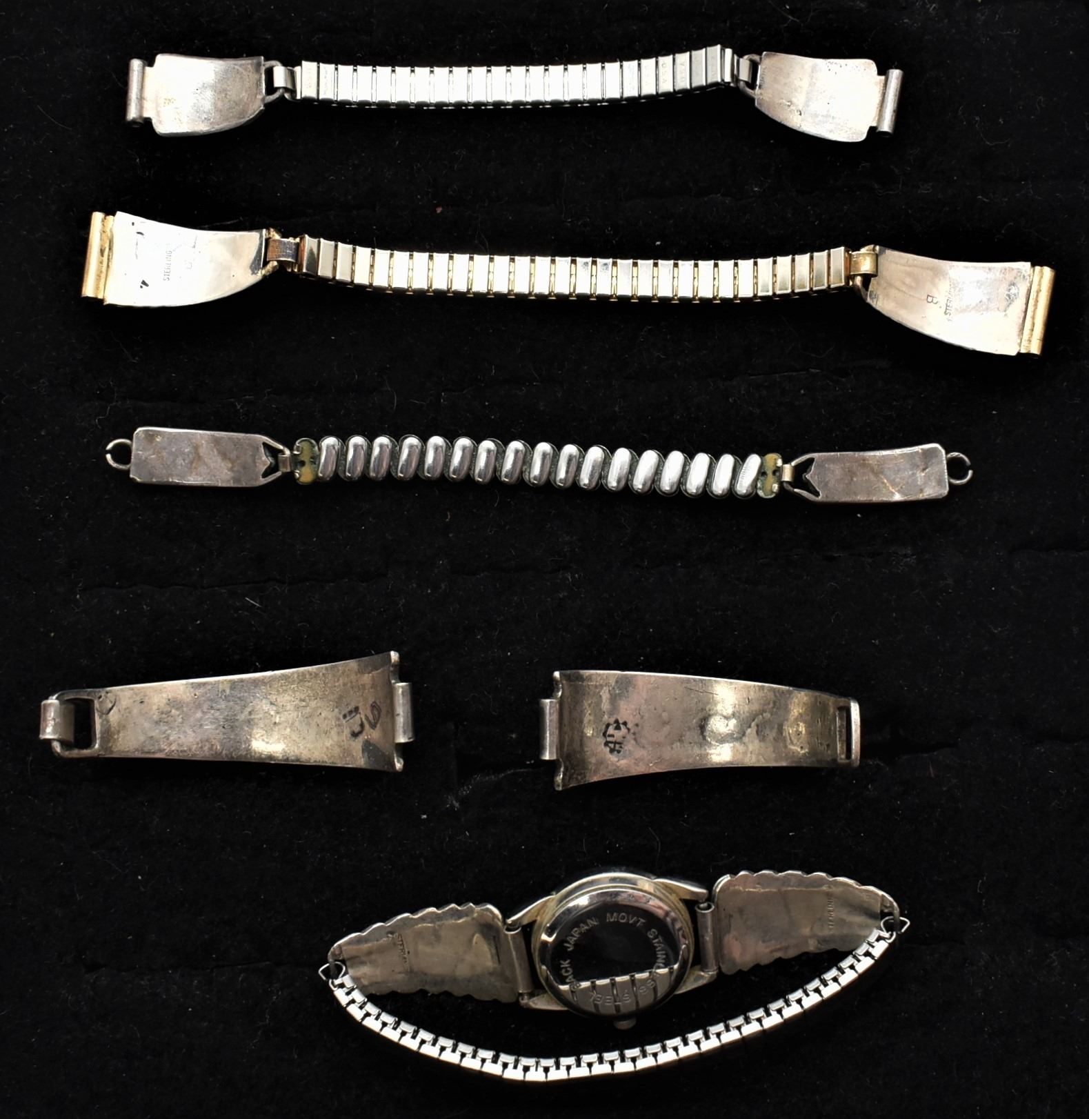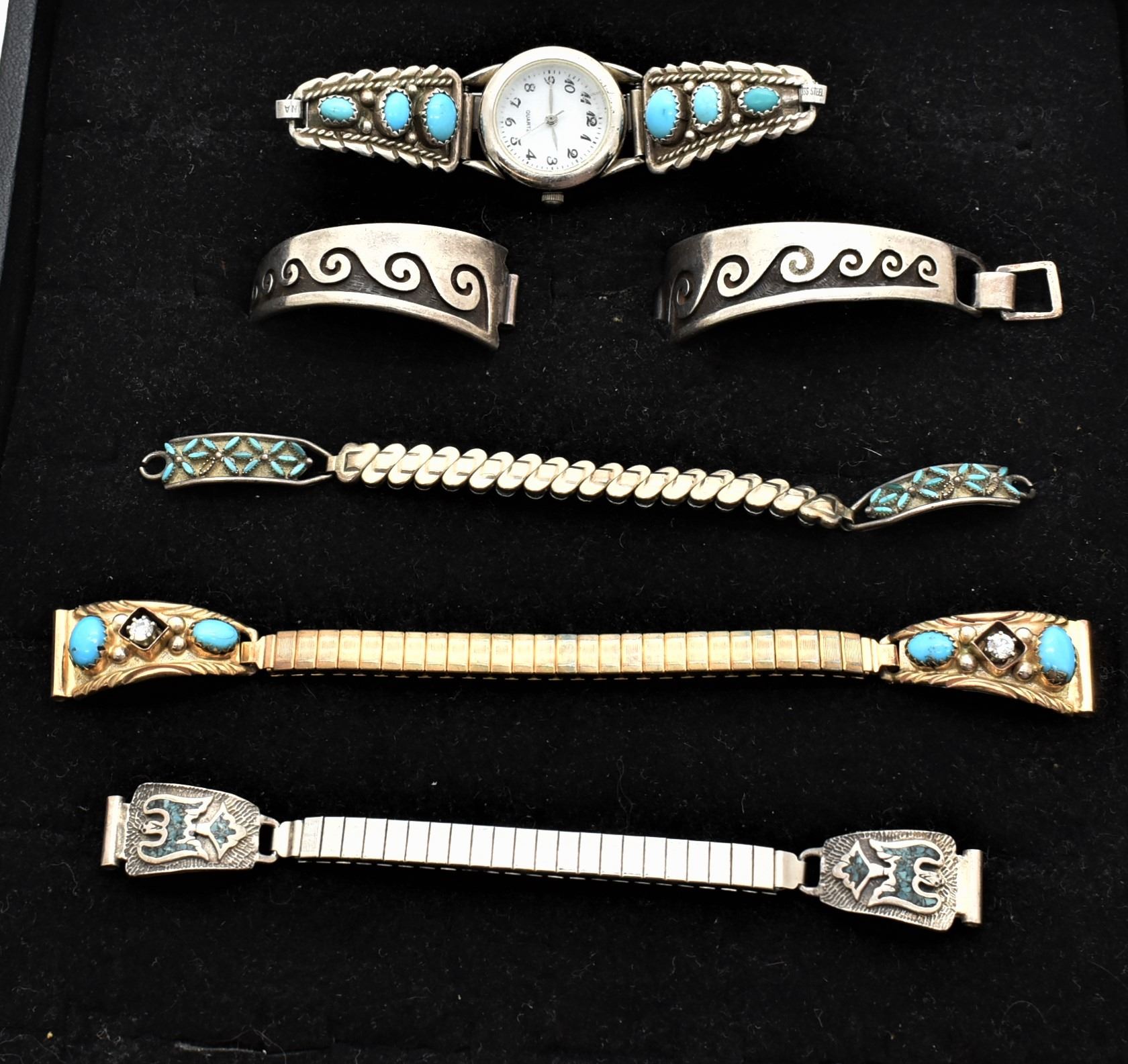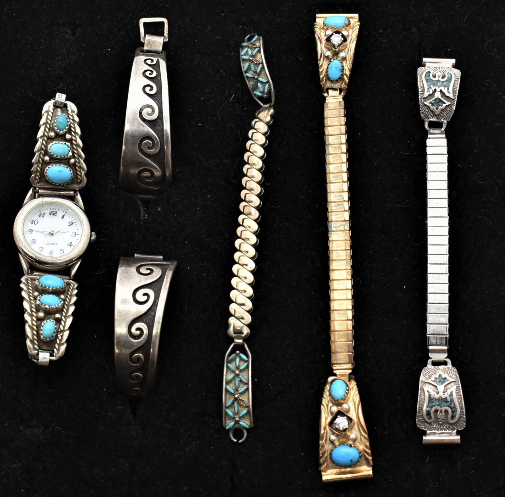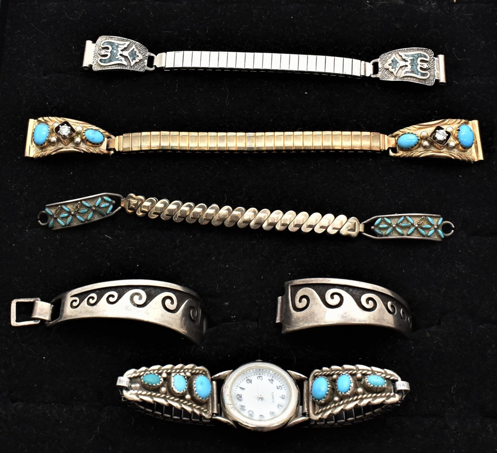 5 Native American Sterling Watch and Gold Filled Watch Bands, includes Navajo Chip Inlay, Navajo Sterling Gold Filled and CZ (hallmarked and stamped sterling), Zuni Needlepoint (vague engraved markings), Hopi Water Wave by Mark Lomayestewa (hallmarked, longest tips measuring 2 5/8''), and Navajo Sterling Turquoise (stamped sterling)