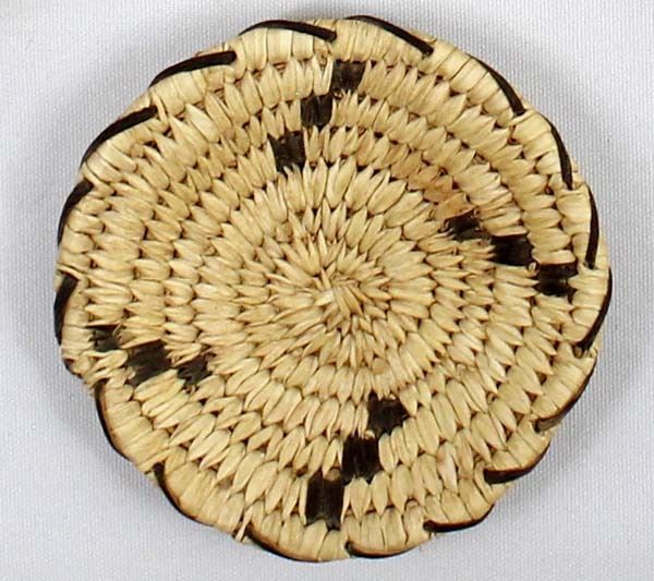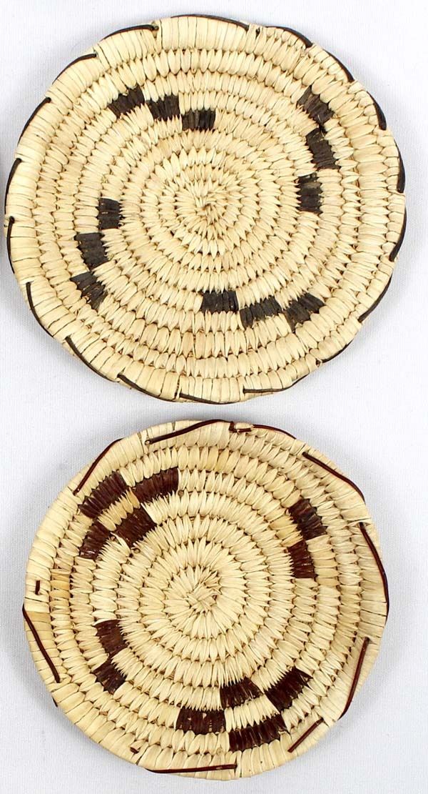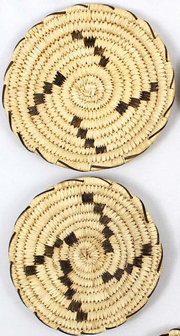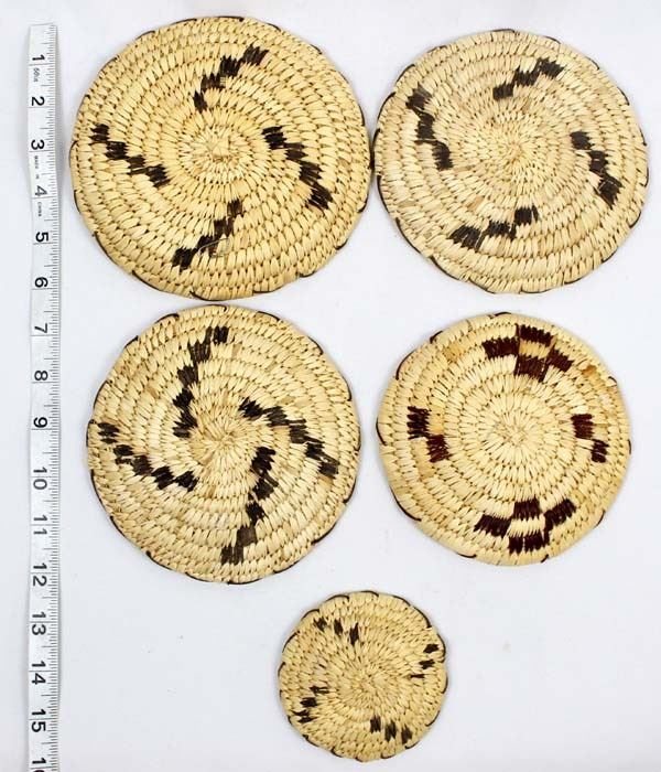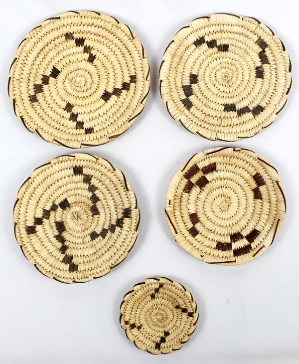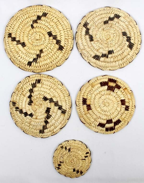 5 Native American Tohono O'odham Flat Baskets, largest measures 6''D