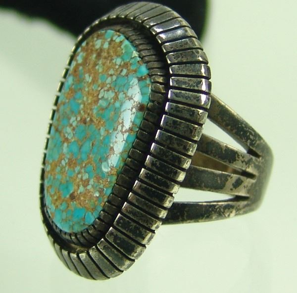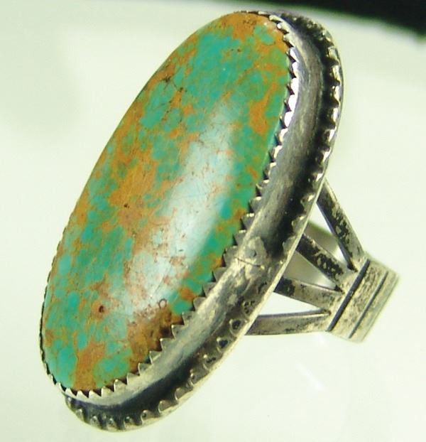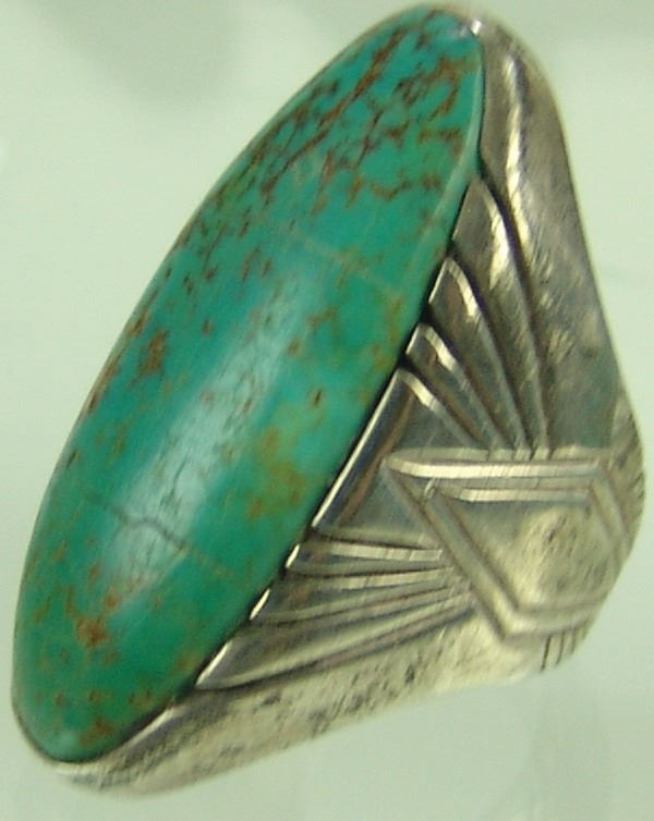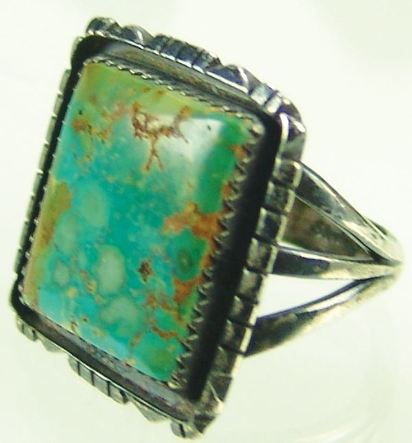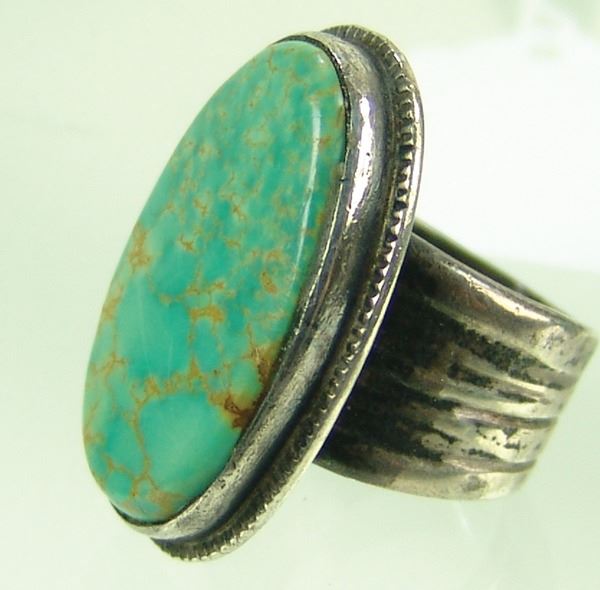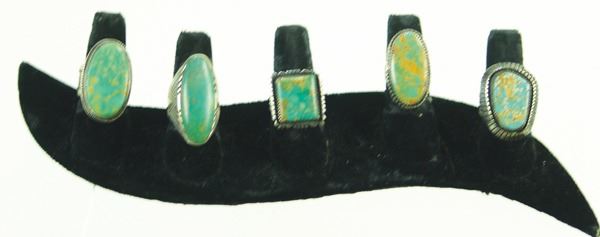 Group of vintage turquoise and silver rings, most heavier gauge, all with large green Cerrillos(?) turquoise stones.Ca.1960s-1980sSizes 6-9