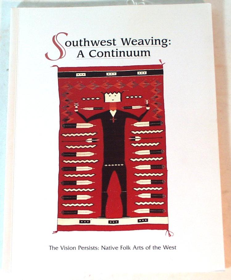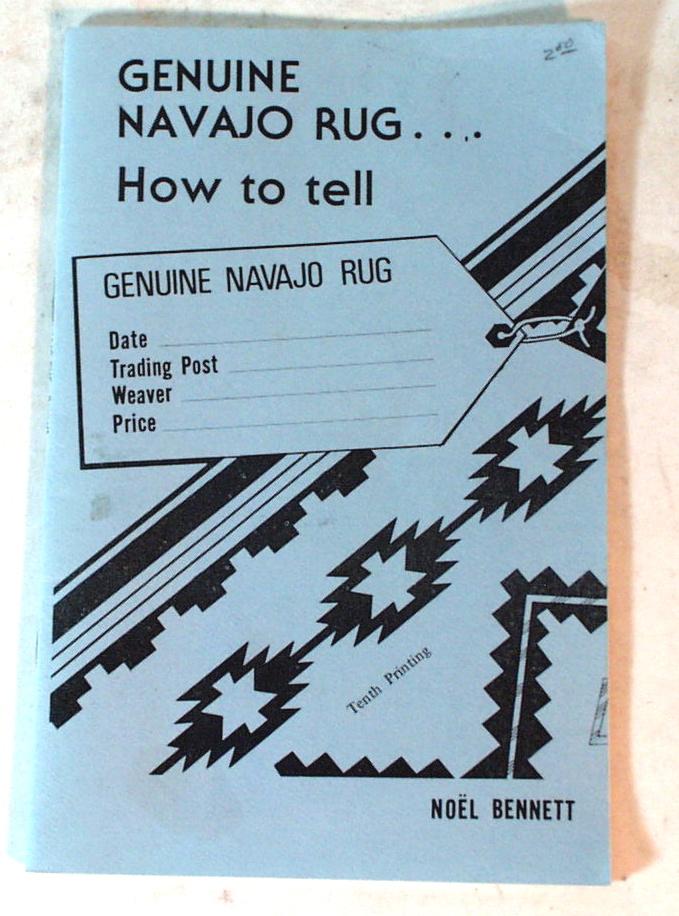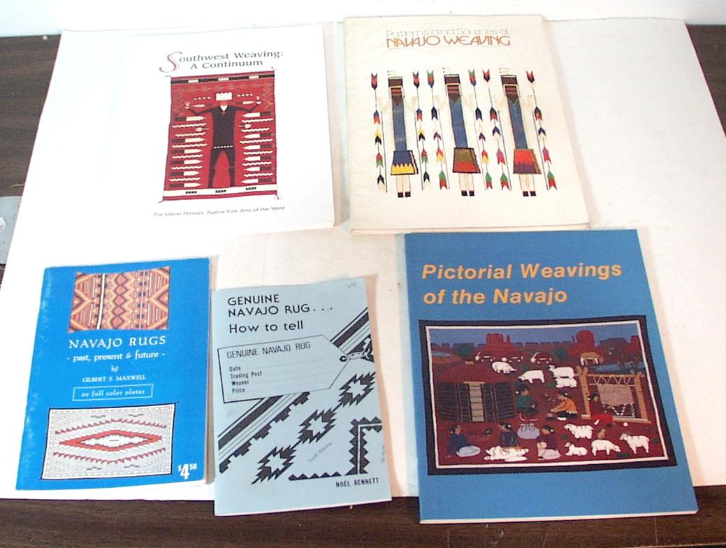 1) Navajo Rugs, past present and future by Gilbert S. Maxwell. 20 full color plates. Softcover. 72 pages. 1963, 1973. Very good condition, light cover rubbing. History of weaving, how a rug is made, rug types and areas, how to buy a rug, how to collect rugs, fact and fancy, 24 black and white photos, trading post map, 2) Genuine Navajo Rug...How to tell by Noel Bennett. Softcover. 24 pages. 1973, 1979. Very good condition. 5-1/4" x 8-1/4". 3) Pictorial Weavings of the Navajo. Softcover. 64 pages. 1991. Very good condition. Many, many color photos. 4) Southwest Weaving: a Continuum. The Vision Persists: Native Folk Arts of the West. Softcover. 74 pages. This catalog is published on the occasion of the 2nd exhibition in the series The Vision Persists, organized by the San Diego Museum of Man, on view from April 1996 through Feb 1997.Many, many photos. 5) Patterns and Sources of Navajo Weaving. Softcover. 68 pages. 1977. Fair condition, many many photos.