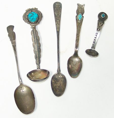 Early/Mid 1900s, Collection of five hand wrought silver spoons from the early 1900s to the mid 1900s, two with turquoise stones, two that have fylfot crosses, and all with stamp or leaf work. All in very good used condition. Longest 5-1/8"