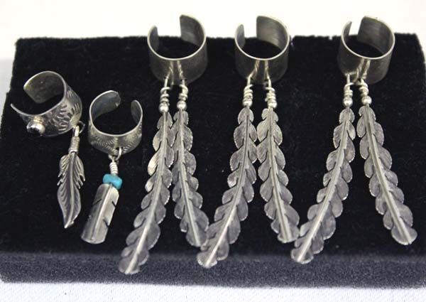 5 Navajo Sterling Ear Cuffs, longest measures 1.75''L, embellished with sterling feather dangles, 1 of the small ones has hand stamping on cuff, and one has a small onyx cab, 9.05g in total wt.