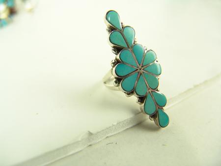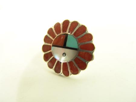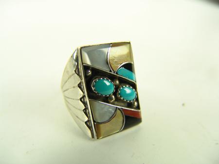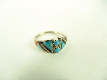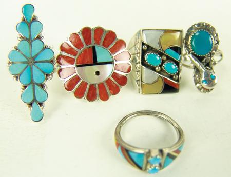 Circa Late 1900s, Collection of four very nice Zuni inlay rings and one Navajo turquoise and silver ring with snake. All in very good/excellent condition. Various