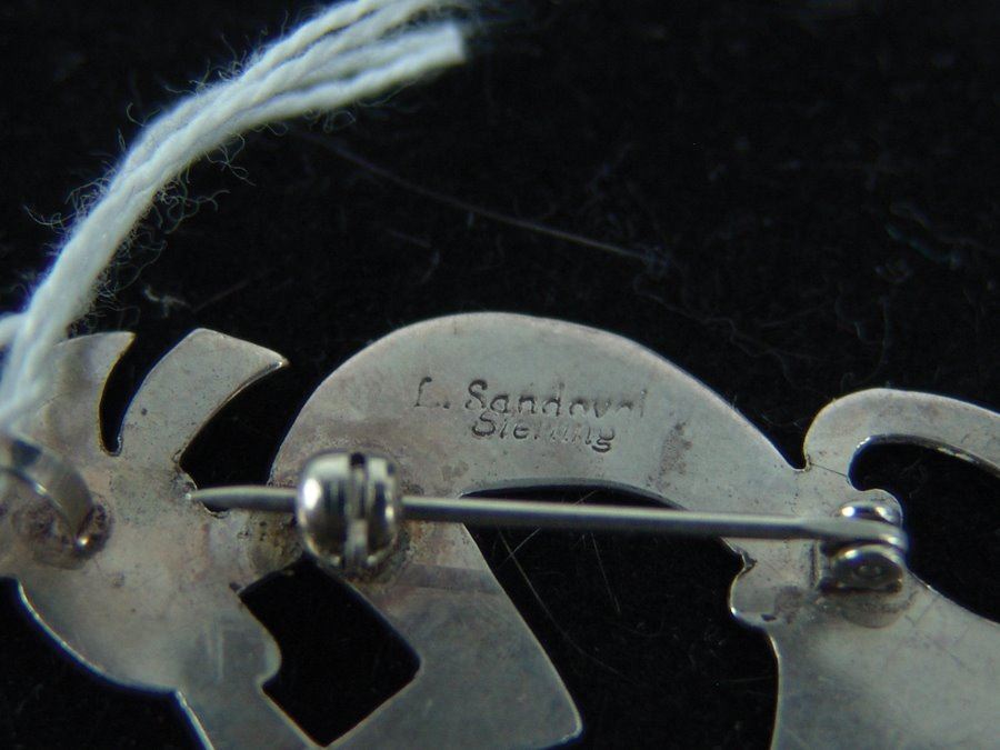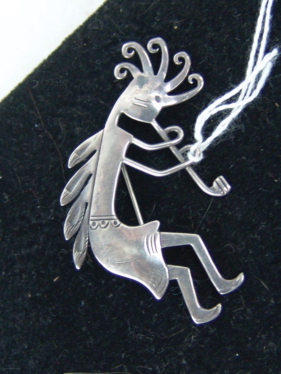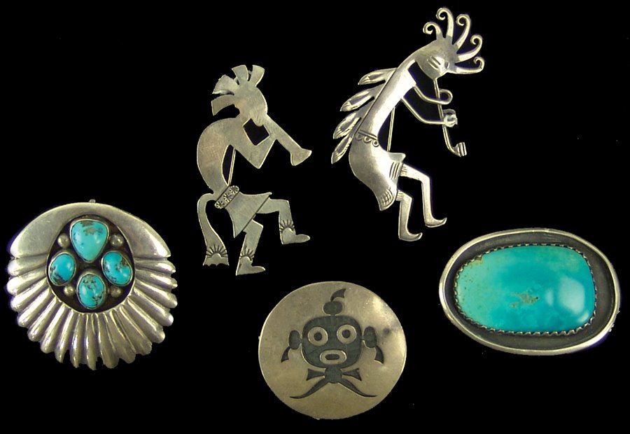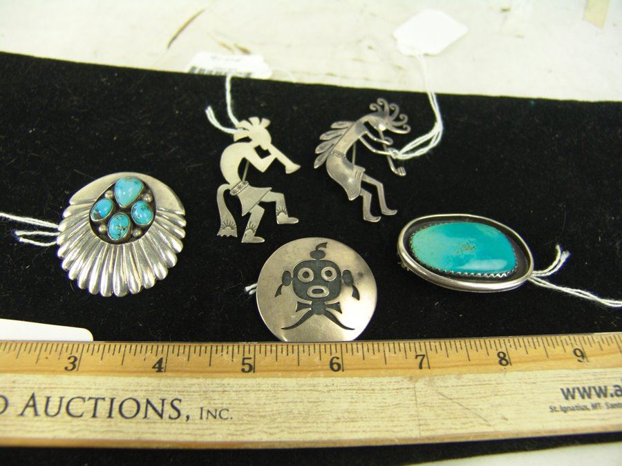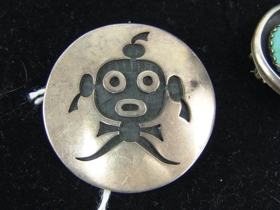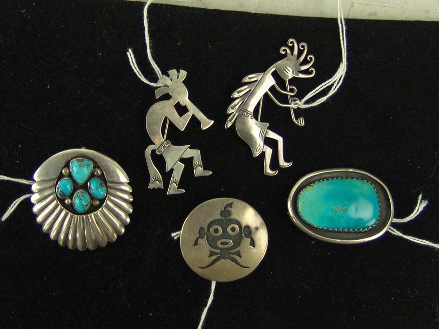 Including two Kokopelli flute playes by L. Sandoval and "SP", a Hopi mudhead overlay by Stewart Tawawina, and two Navajo, a radiating shadowbox signed " LL", and one with a large turquoise stone. Very good condition.,,2"