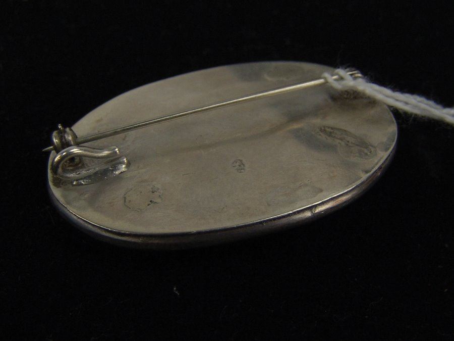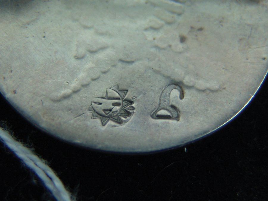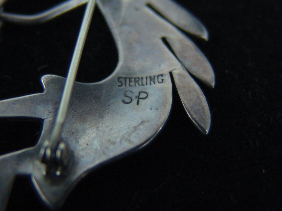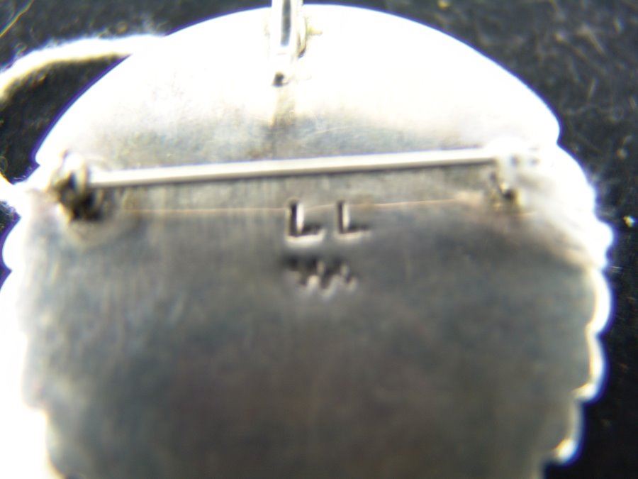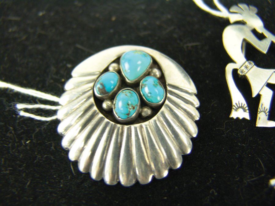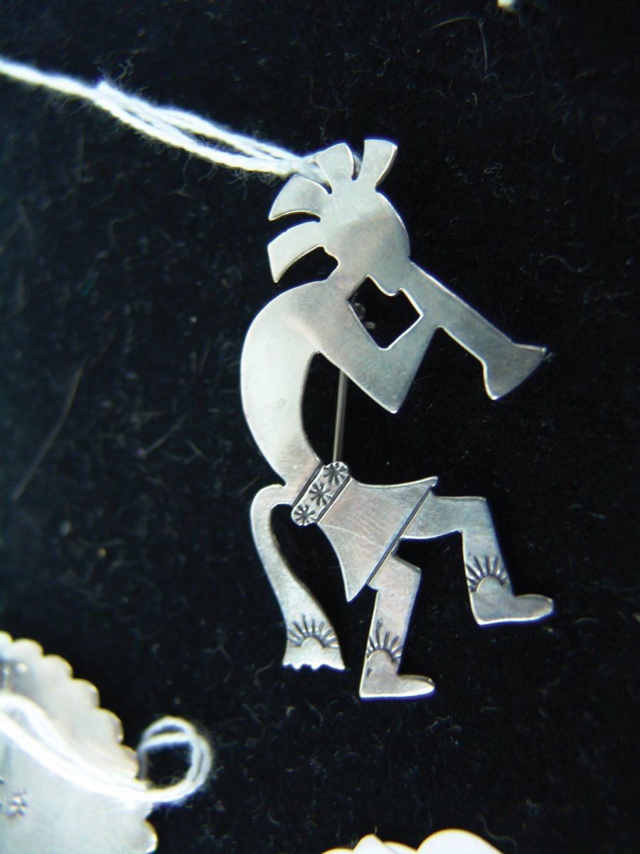 Including two Kokopelli flute playes by L. Sandoval and "SP", a Hopi mudhead overlay by Stewart Tawawina, and two Navajo, a radiating shadowbox signed " LL", and one with a large turquoise stone. Very good condition.,,2"