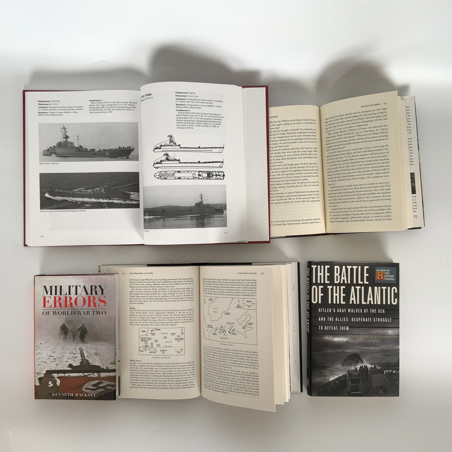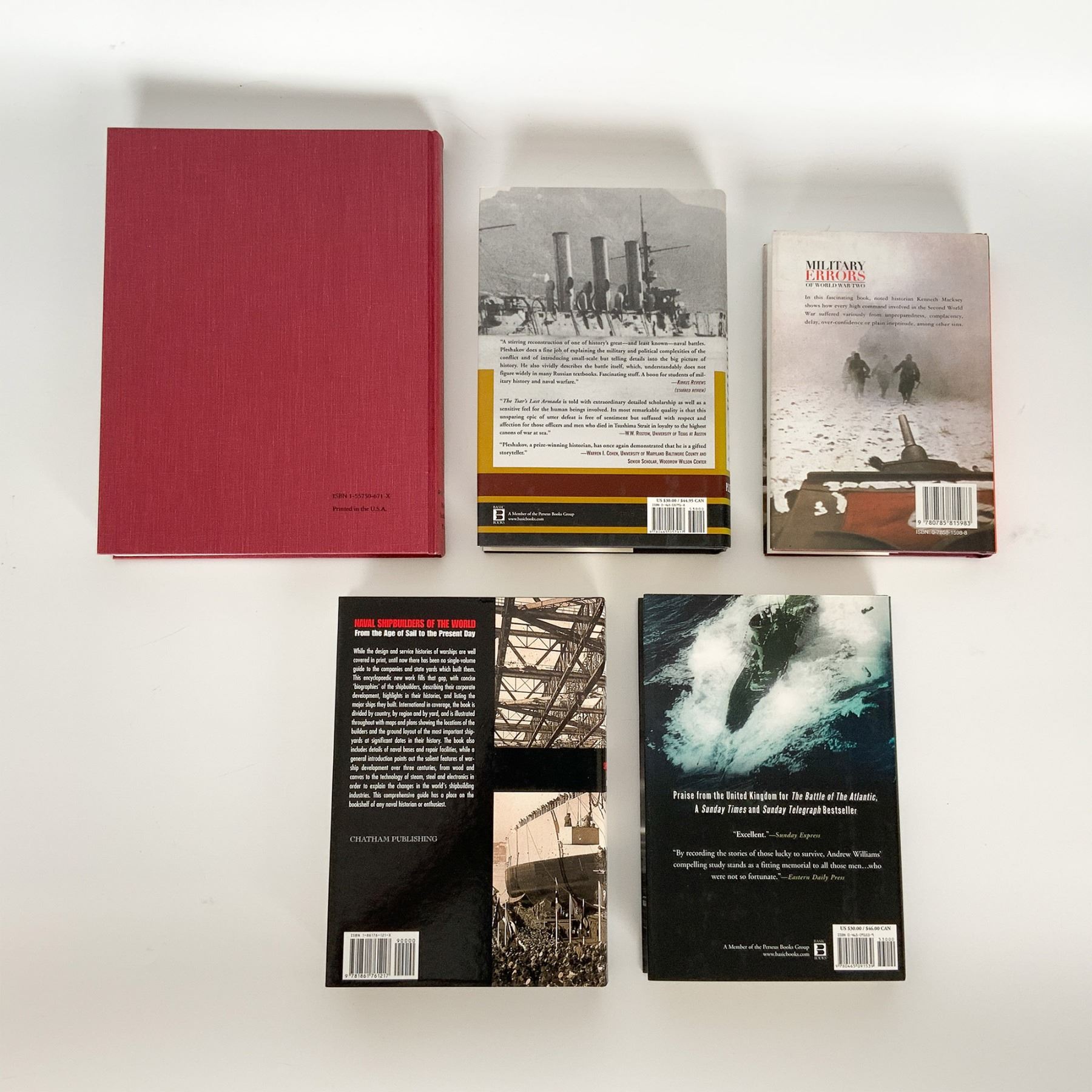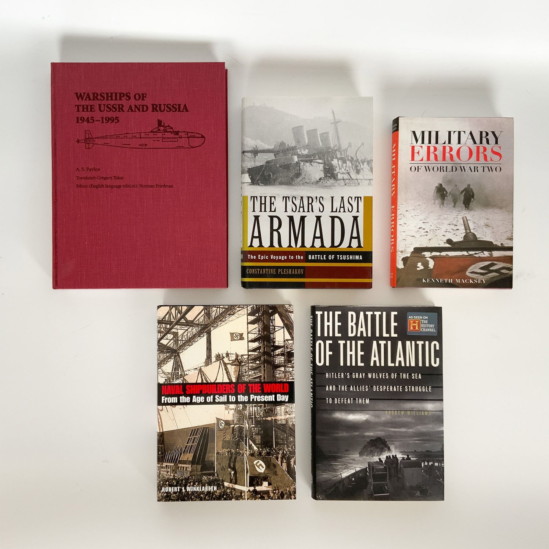 This lot includes five hardcover books covering significant naval and military history topics. Titles include Military Errors of World War Two by Kenneth Macksey, analyzing strategic and tactical misjudgments during WWII; The Battle of the Atlantic by Andrew Williams, detailing the crucial naval conflict between Allied and Axis forces; Naval Shipbuilders of the World by Robert L. Scheina, exploring shipbuilding history across various nations; The Tsar's Last Armada by Constantine Pleshakov, recounting the ill-fated Russian Baltic Fleet voyage during the Russo-Japanese War; and Warships of the USSR and Russia 1945-1995 by Stephen McLaughlin, an authoritative reference on Soviet and Russian naval power in the Cold War era. These books offer valuable insights for historians, researchers, and naval enthusiasts.