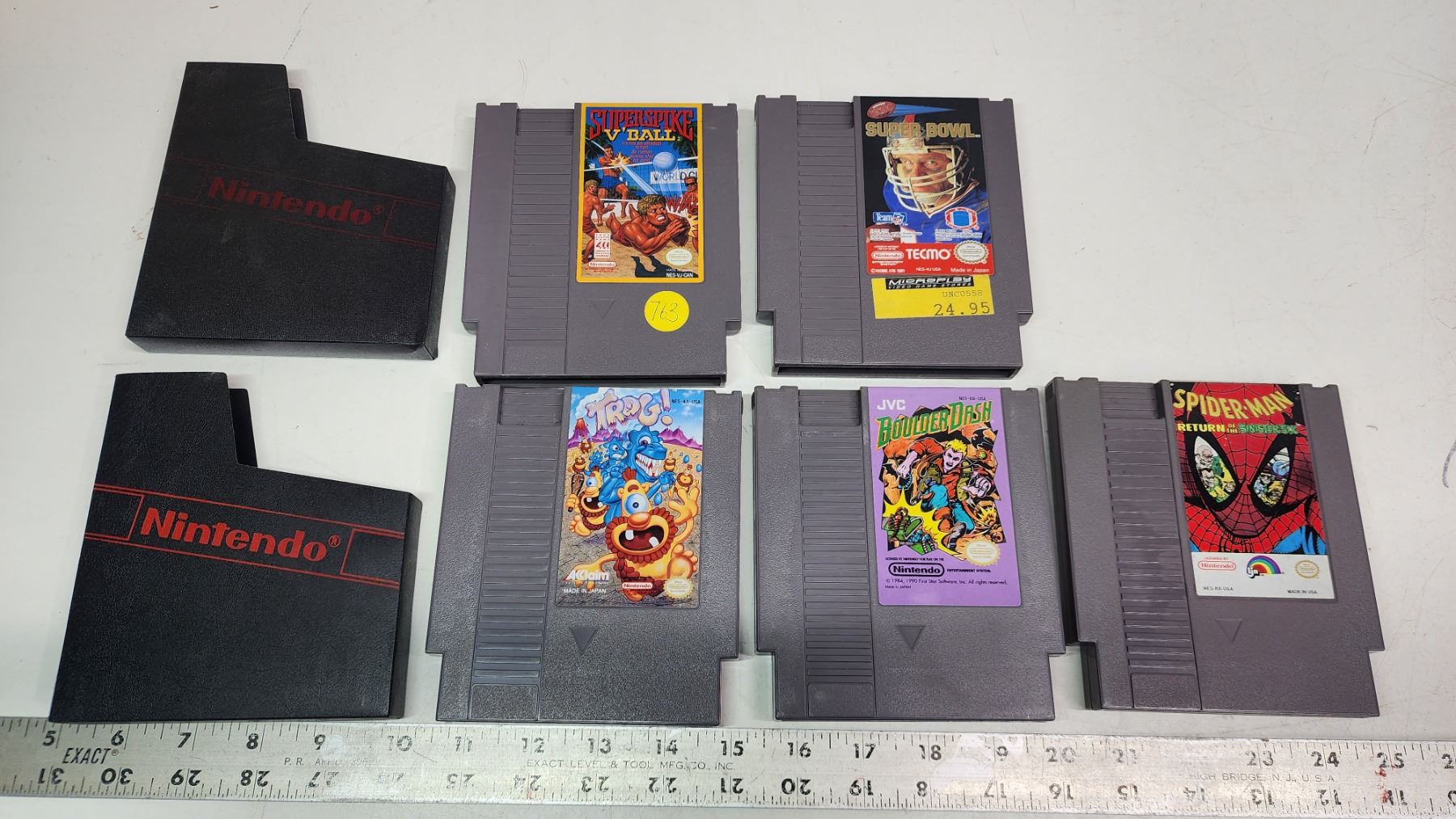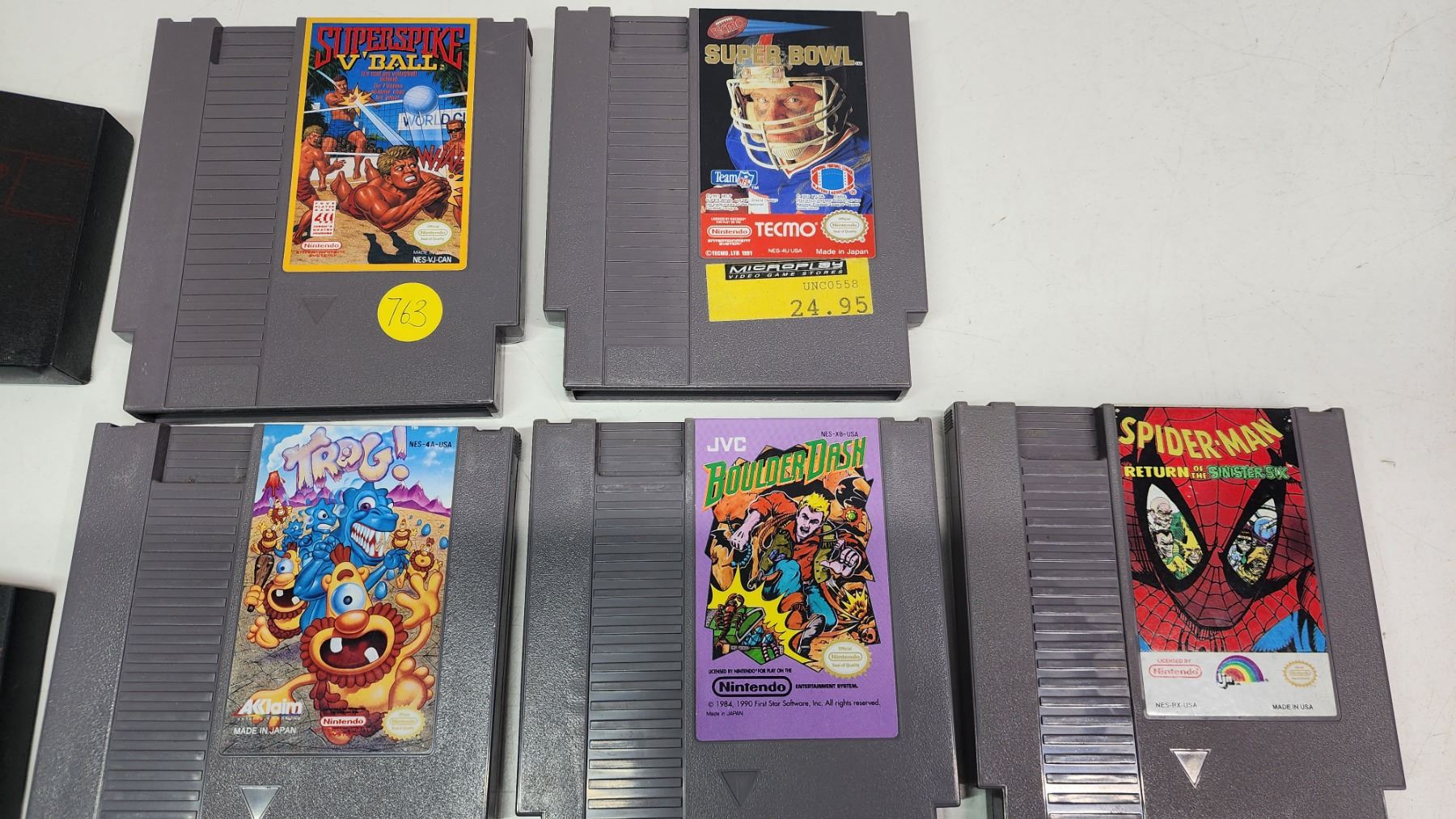 5 Nintendo Entertainment system games - Super Spike, Trog, Boulder Dash, Spiderman, and Tecmo super