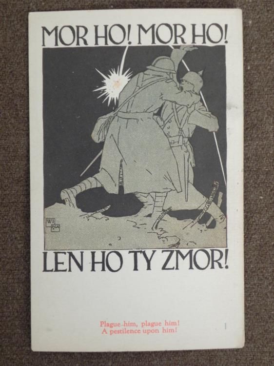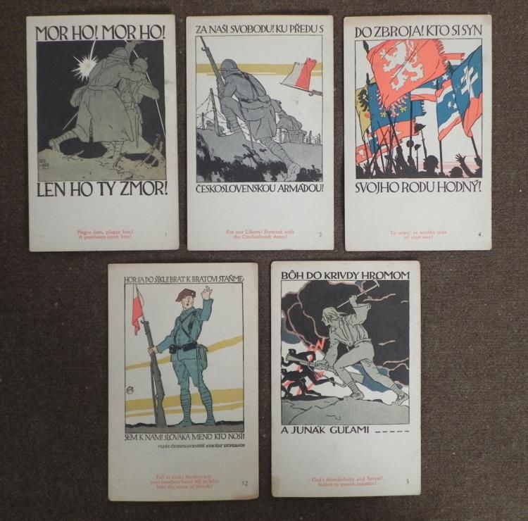 5 ORIGINAL WWI CZECHOSLOVAKIAN MILITARY POSTCARDS TO RECRUIT FOR THE WAR 3 1/2 X 5 1/2"-- WITH WWI MILITARY SUBJECT MATTER--GEARED TO PROMPT CZECHOSLOVAKIAN MEN IN AMERICA TO JOIN FORCES WITH THE CZECHS TO FIGHT GERMANY IN WWI--ISSUED BY THE CZECH RECRUIT
