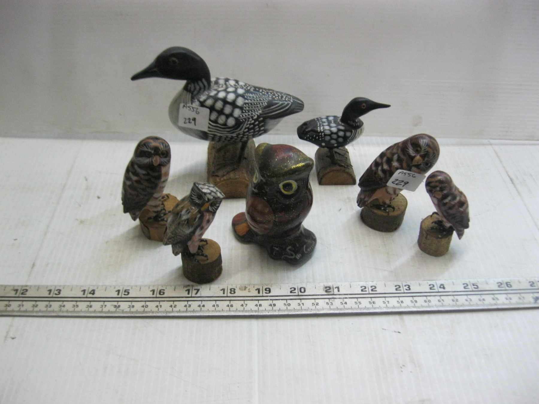 5 OWL FIGURINES & 2 LOON FIGURINES