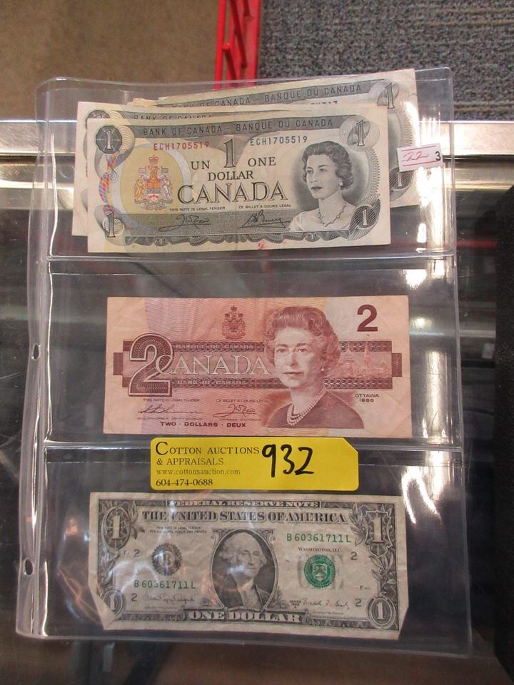 One US 1988 A Series $1. One 1986 Canadian $2 and Three x 1973 Canadian $1.