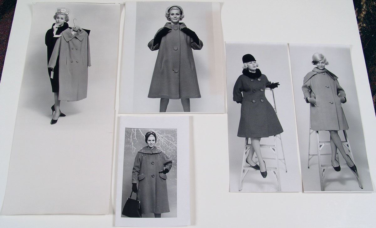 This is a lot of five vintage 1960s original Carl Bakula photographs taken to promote Dayton's department store in Minnesota. A blonde deciding between several heavy winter wool coats.