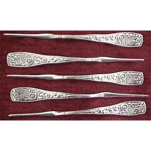 This is a set of 5 silverplate nut picks in a swirling ornate Victorian pattern by A F Towle.These picks are 4.75" long and in wonderful unmonogrammed condition. Shipping to US addresses is $5.