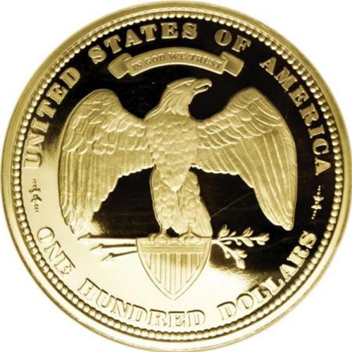 <B>Private "1876 $100 Gold Union" Ultra Cameo Gem Proof NGC.</B></I> Five ounces of 999 Fine gold. Struck by the private New York Mint in 2005. The designs are based on sketches by Mint engraver George T. Morgan for a proposed $100 gold coin. One of the first 300 struck, although the actual mintage is unknown. A cherry-wood presentation case is included.<BR><BR><b>Shipping:</b> Coins & Currency (<a target="_blank" href="http://www.heritageauctions.com/common/shipping.php">view shipping information</a>)