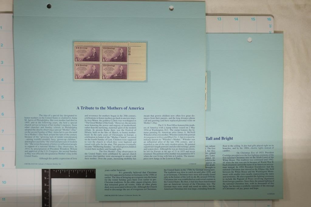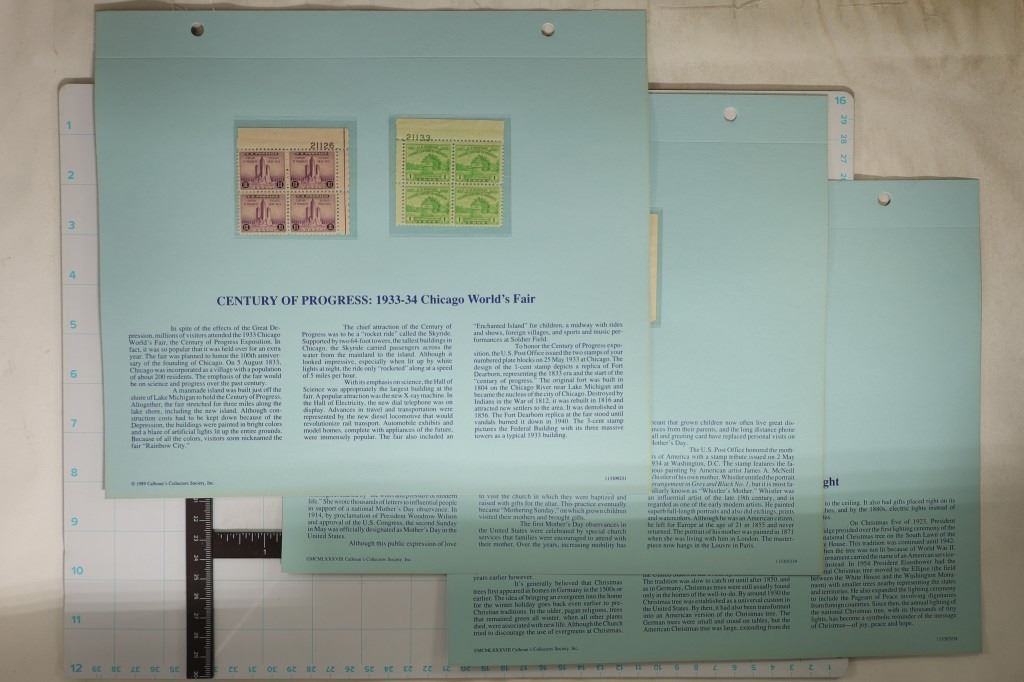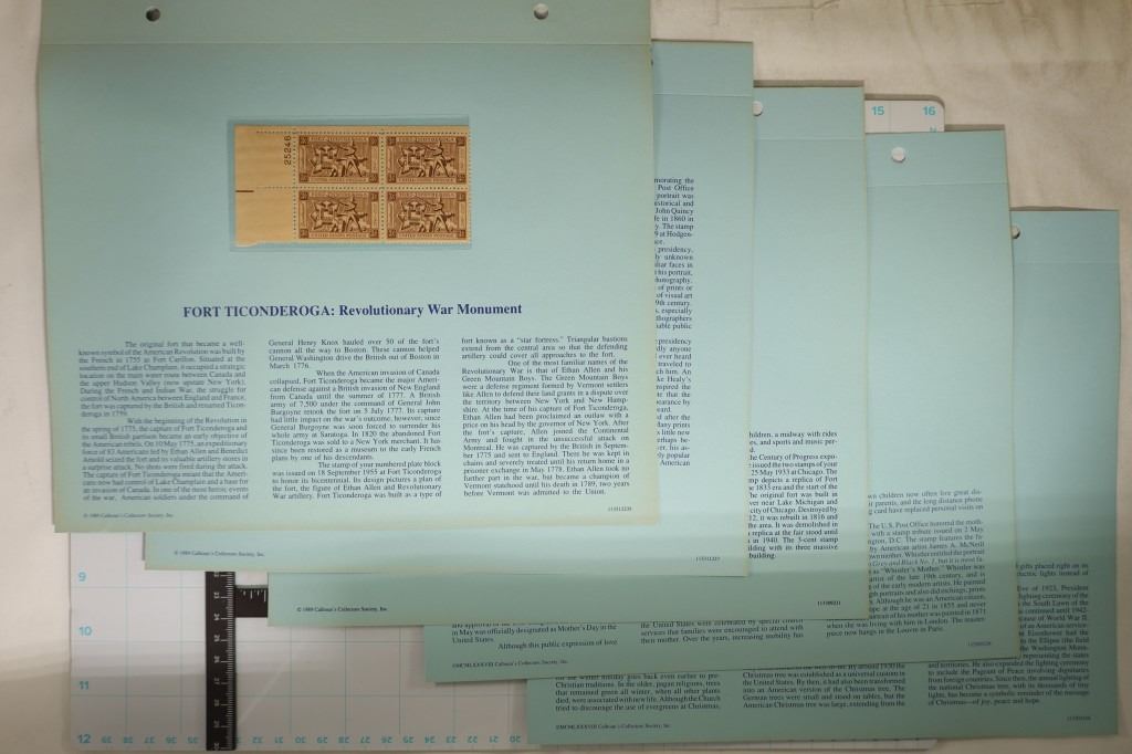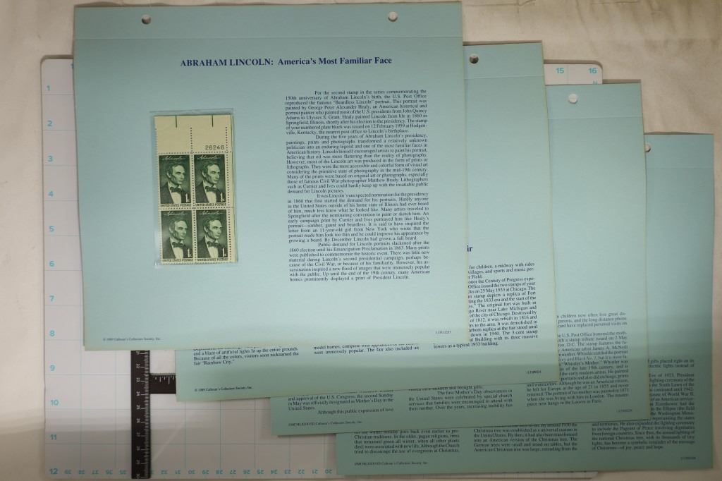 OF 4 THREE CENT, 1 BLOCK OF 4 ONE CENT ABRAHAM LINCOLN, 1 PAGE WITH 2 BLOCKS OF 4 (1 SET OF THREE CENT AND 1 SET OF ONE CENTS), 1 PAGE WITH 1 BLOCK OF 4 THREE CENTS (MOTHERS OF AMERICA) AND THE LAST PAGE WITH 1 BLOCK OF
