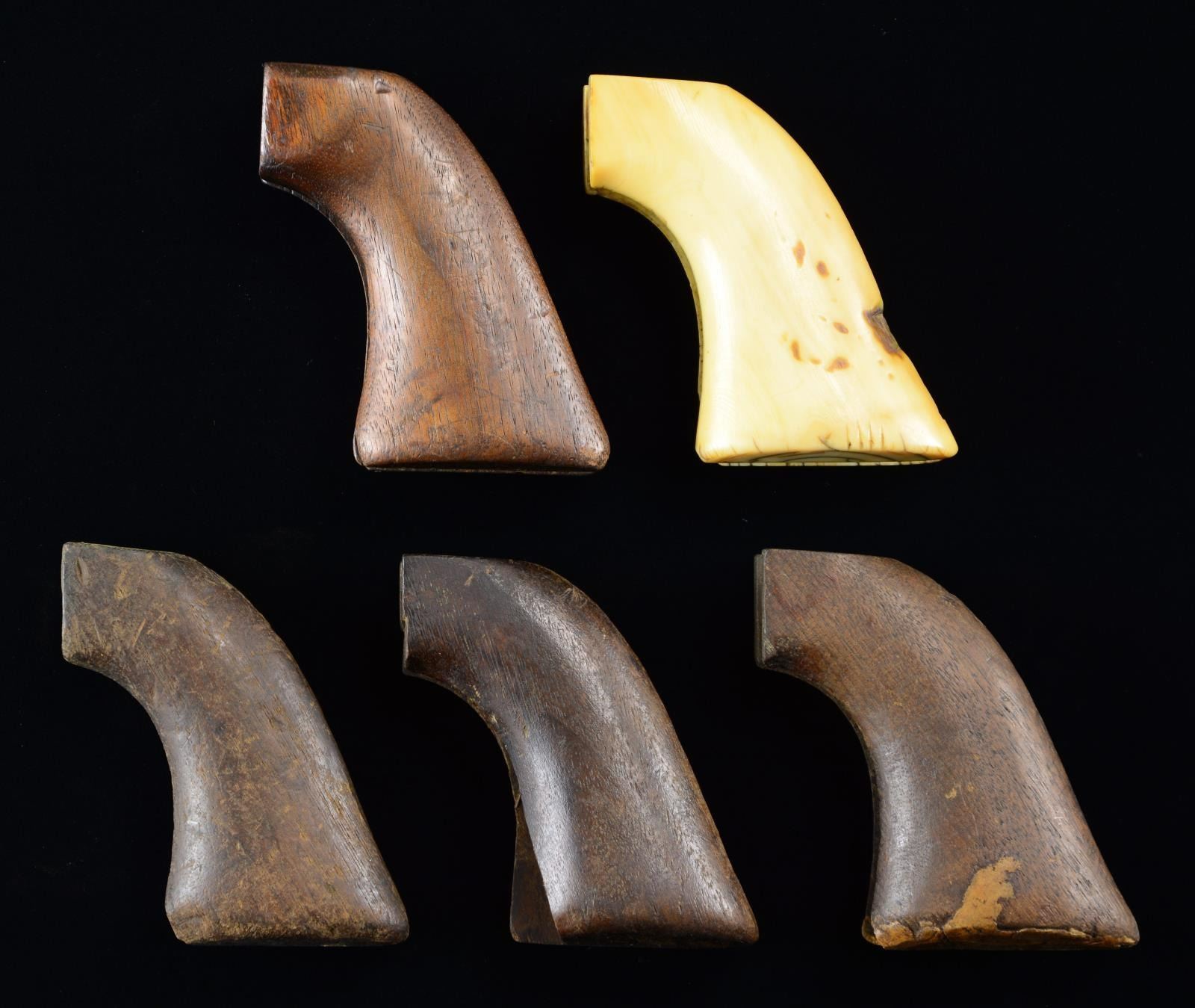 One pair are original 1-pc smooth ivory with rich patina; the other 4 are rough wood, one with aluminum insets. CONDITION: ivory grips are very good with1/2" well patinaed chipped toe. The wood grips are poor to fair with putty repair on one, partial S#s visible on at least two. PROVENANCE: Martin Lane Historic & Western Americana Lifetime Collection. (02-21380-3/JS). $500-700.