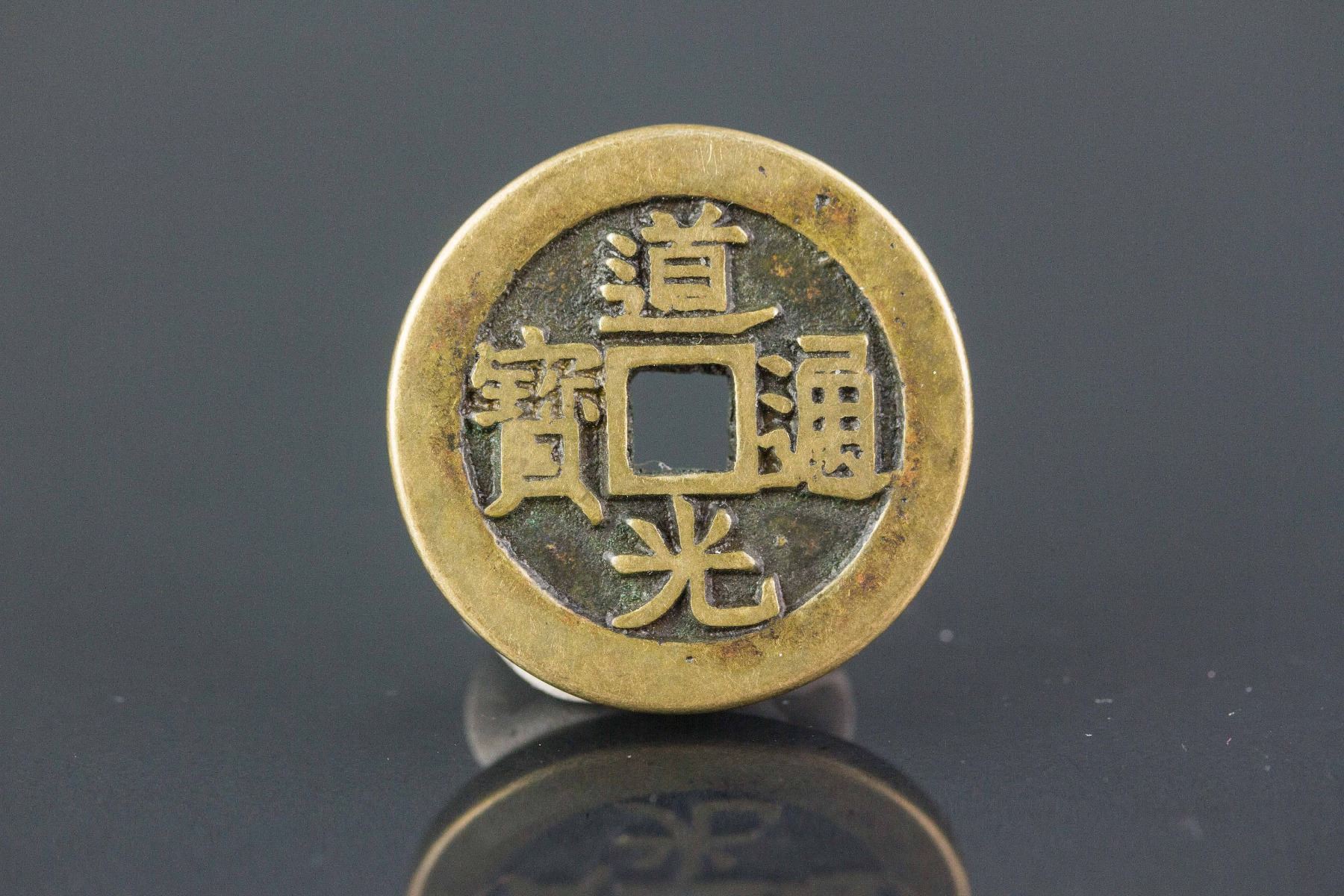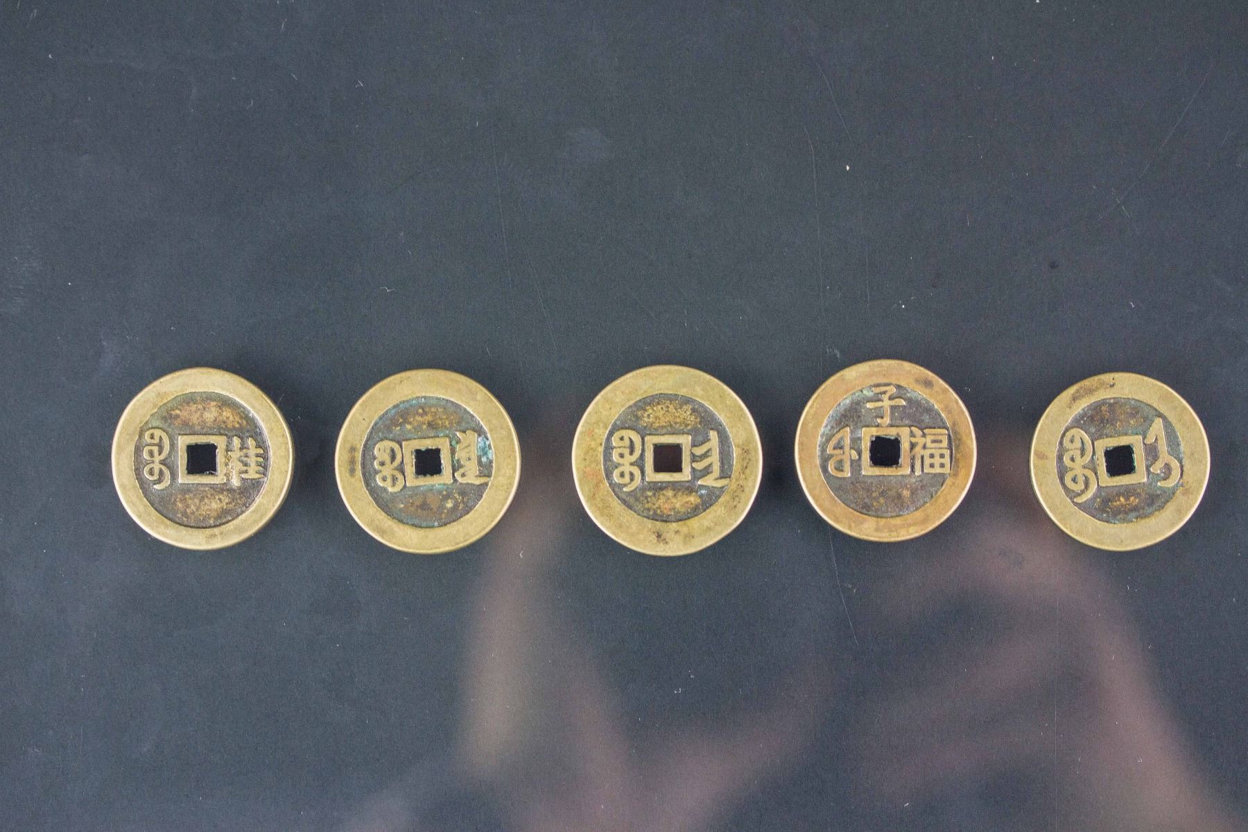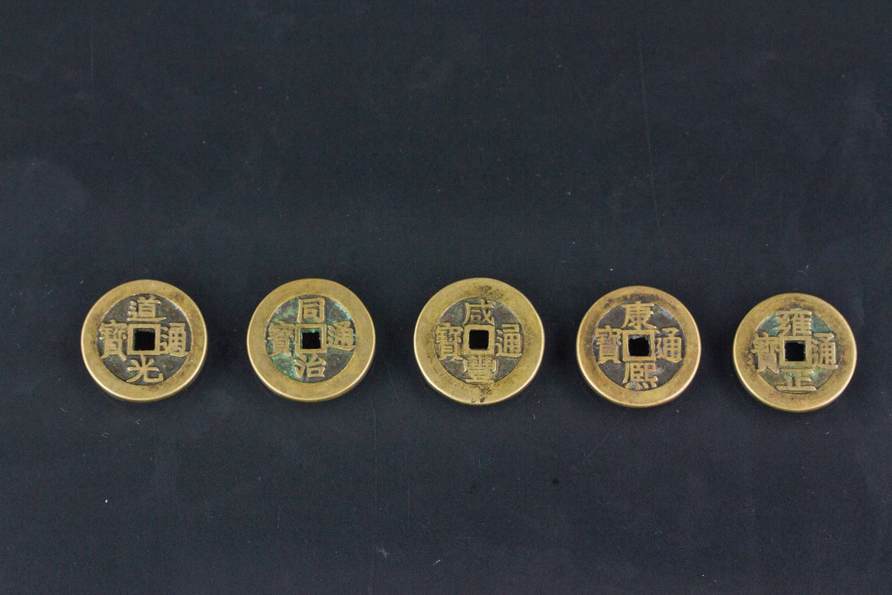 Five pieces of assorted Chinese bronze coin; of round shape with square hole; one Daoguang Tongbao, one Tongzhi Tongbao, one Xianfeng Tongbao, one Kangxi Tongbao, one Yongzheng Tongbao; D: 2.75 cm, 8 grams each