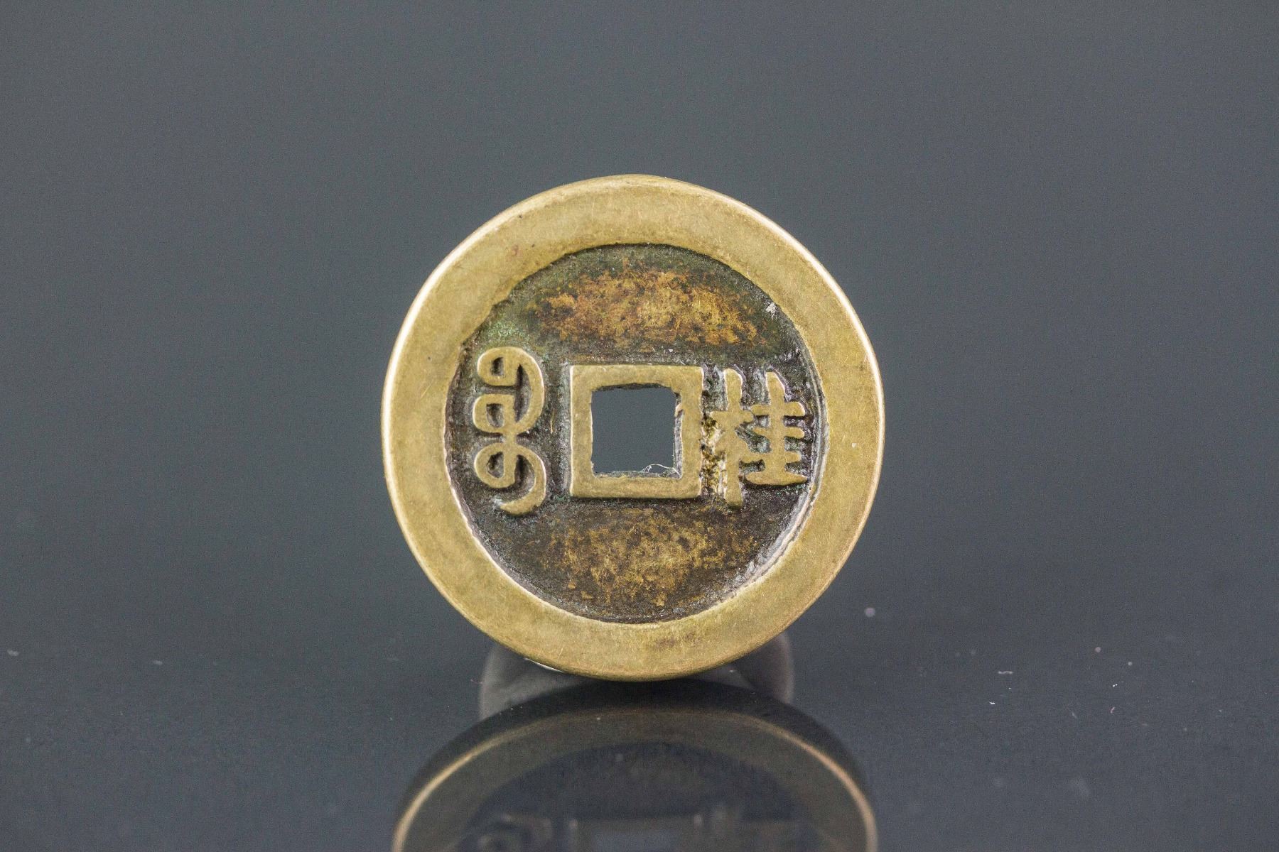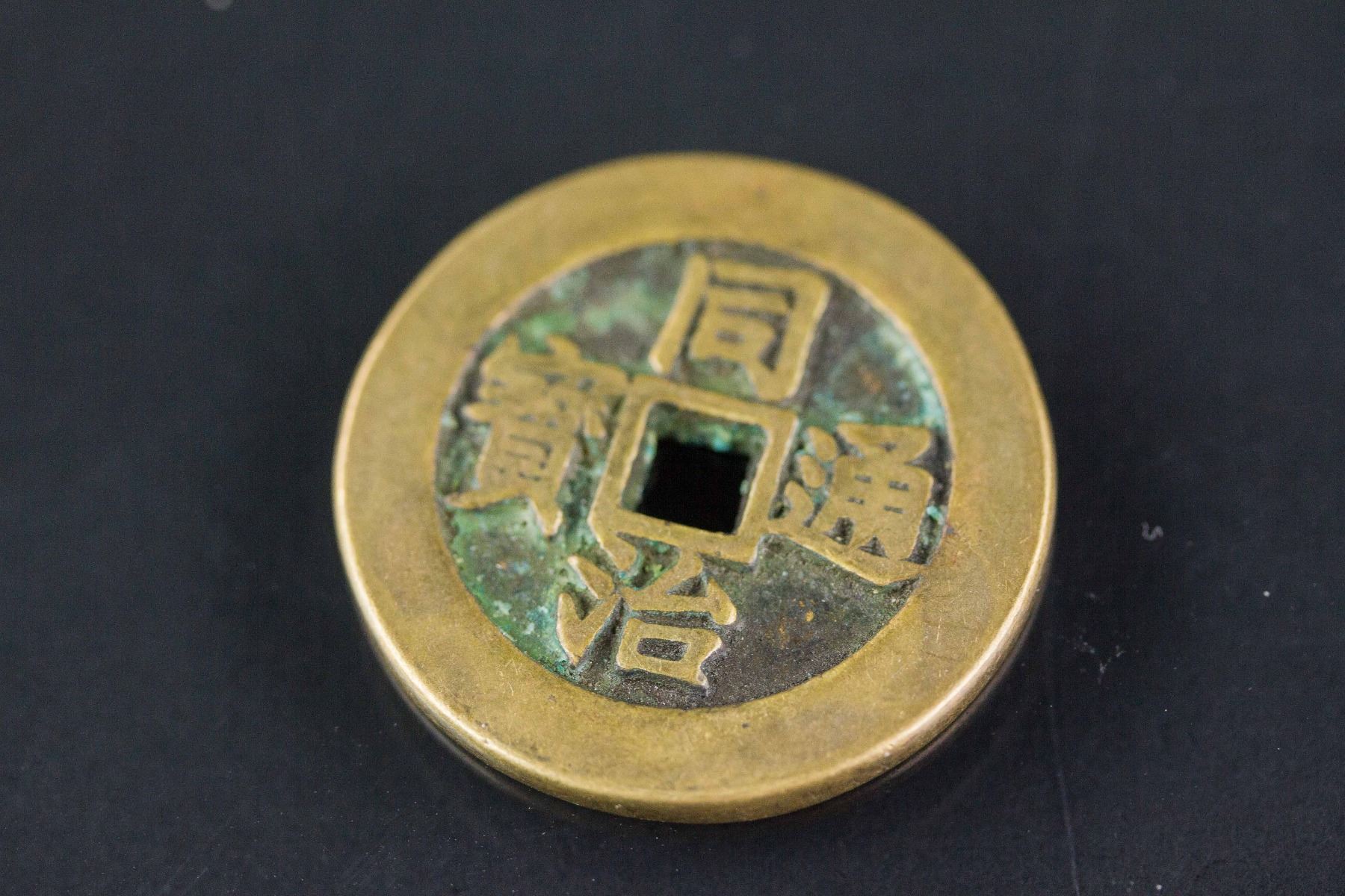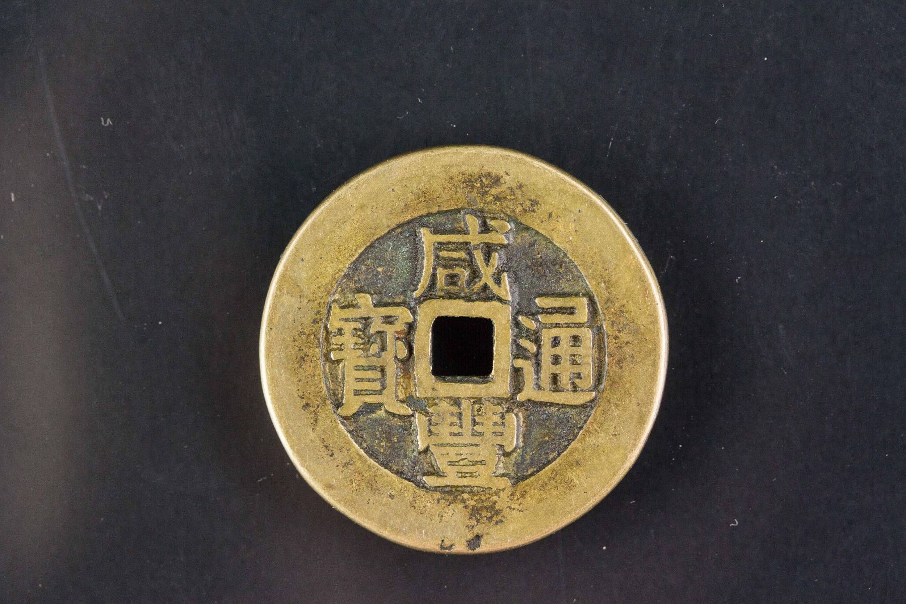 Five pieces of assorted Chinese bronze coin; of round shape with square hole; one Daoguang Tongbao, one Tongzhi Tongbao, one Xianfeng Tongbao, one Kangxi Tongbao, one Yongzheng Tongbao; D: 2.75 cm, 8 grams each