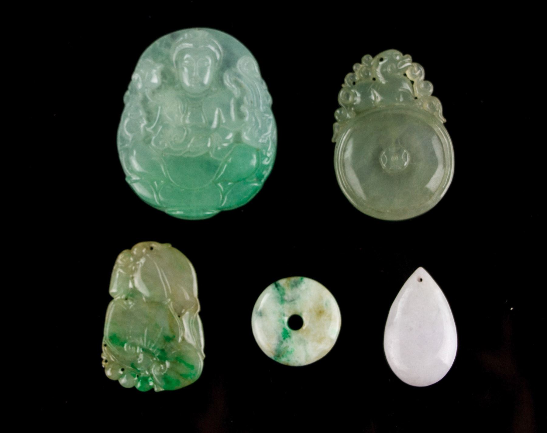 5 pieces of assorted hardstone carved pendant; of one Guanyin pendant; one coin pendant; one ruyi pendant; one peace ring pendant; one tear pendant; all pierced for suspension; H: 4.5 cm, D: 4.5 cm, 39 grams