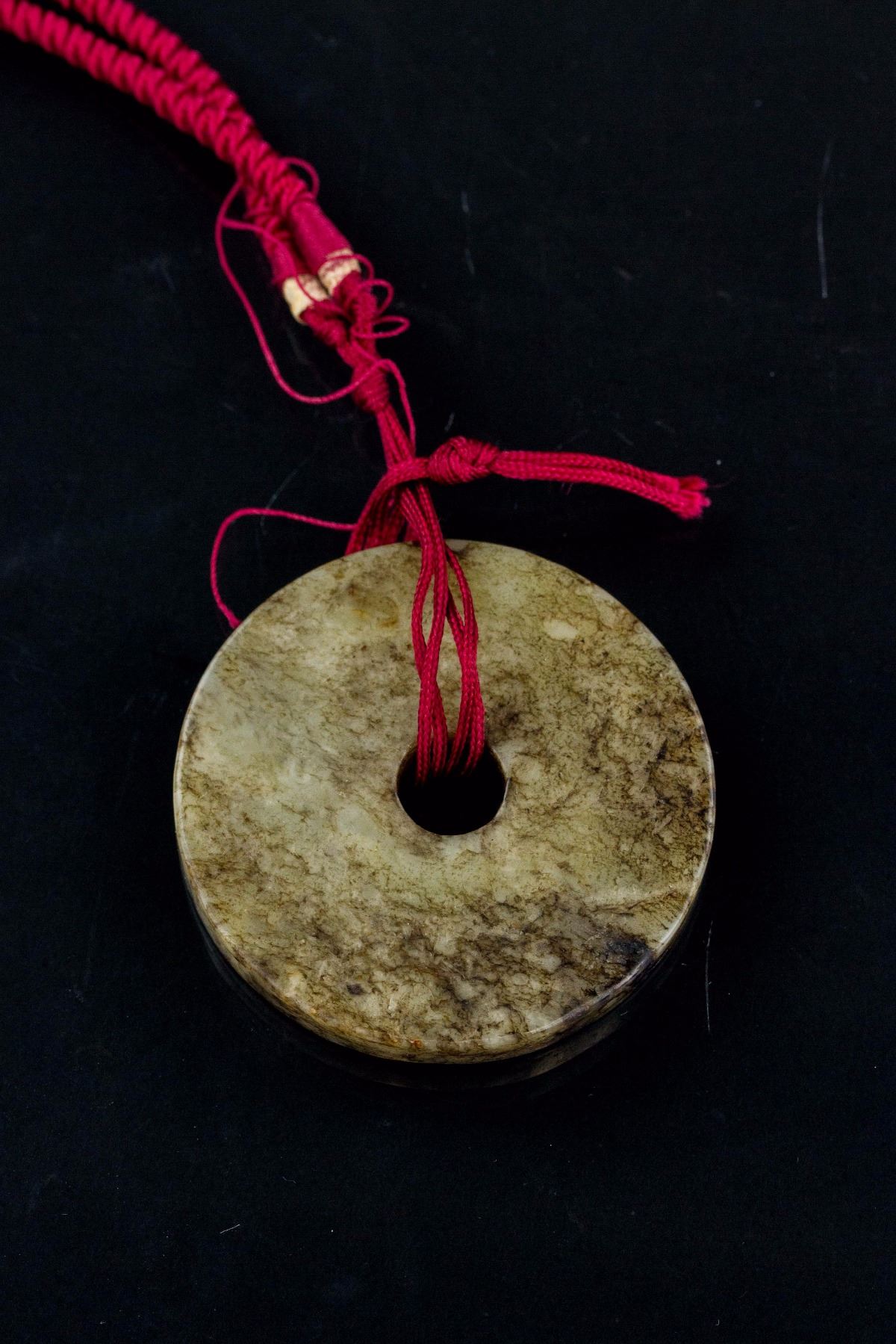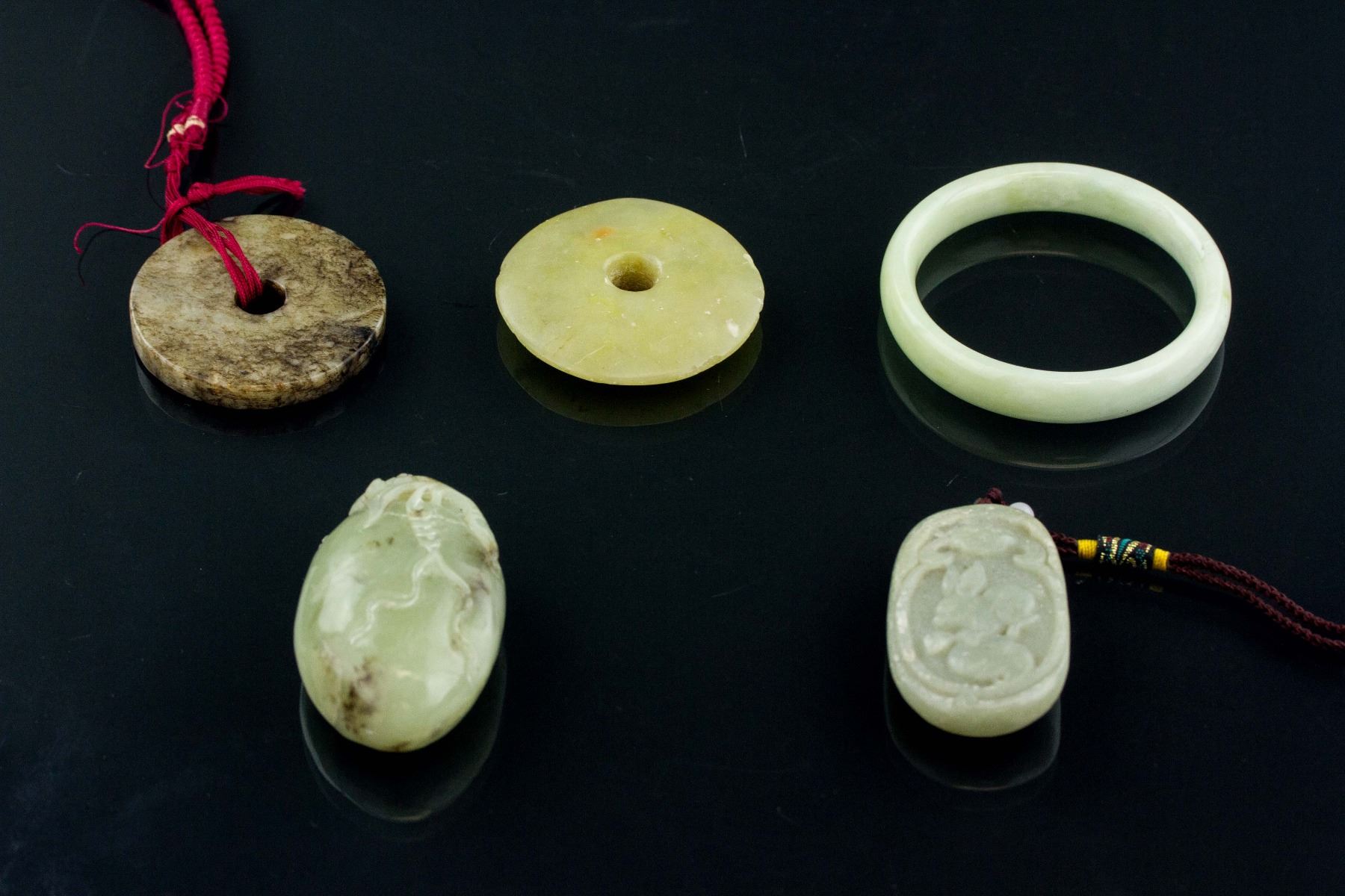 Five pieces of assorted Chinese hardstone item; comprised of two peace pendants, two toggles and one bangle; D: 7.5 cm (Bangle), 329 grams (total)