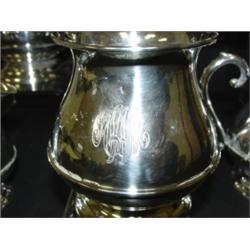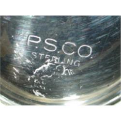 5 PIECE STERLING TEA SERVICE. Consists of one teapot (10" H), one coffee pot (8.5" H), sugar & covered creamer, & one open cup. Monogrammed. Marked on bottom "P.S.C.O.-Sterling-10".