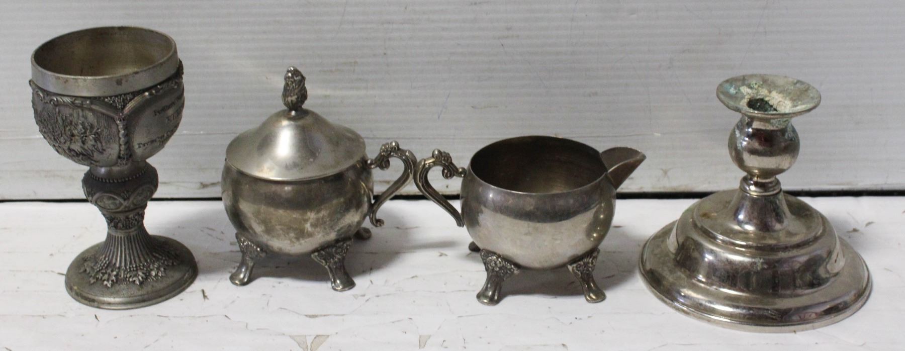 5 PCS. PEWTER CUP, CANDLE HOLDER, TEAPOT/CUP-