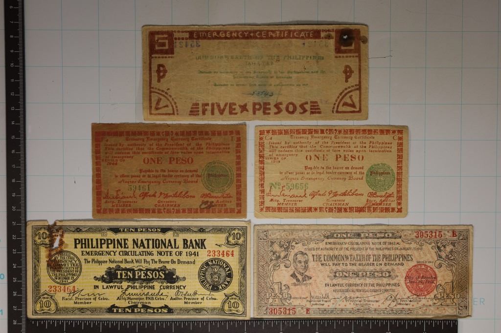 3-ONE PESO, 1-FIVE PESO AND 1-TEN PESO. SOME HOLES AND STAINS NOTED AS SHOWN
